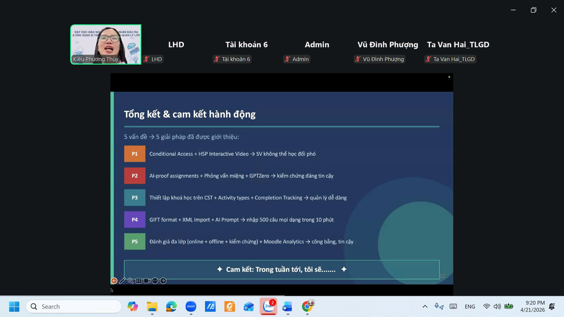 Một điểm nổi bật trong phần chia sẻ của TS. Kiều Phương Thùy là các “mẹo” và giải pháp thực hành giúp giảng viên thiết kế cơ chế để sinh viên buộc phải hoàn thành các nhiệm vụ trên CST. Đây là nội dung nhận được nhiều sự quan tâm bởi trong mô hình dạy học kết hợp, việc sinh viên có thực sự tự học trước, hoàn thành học liệu và nhiệm vụ được giao trên CST hay không có ý nghĩa quyết định đối với chất lượng của giờ học trực tiếp.