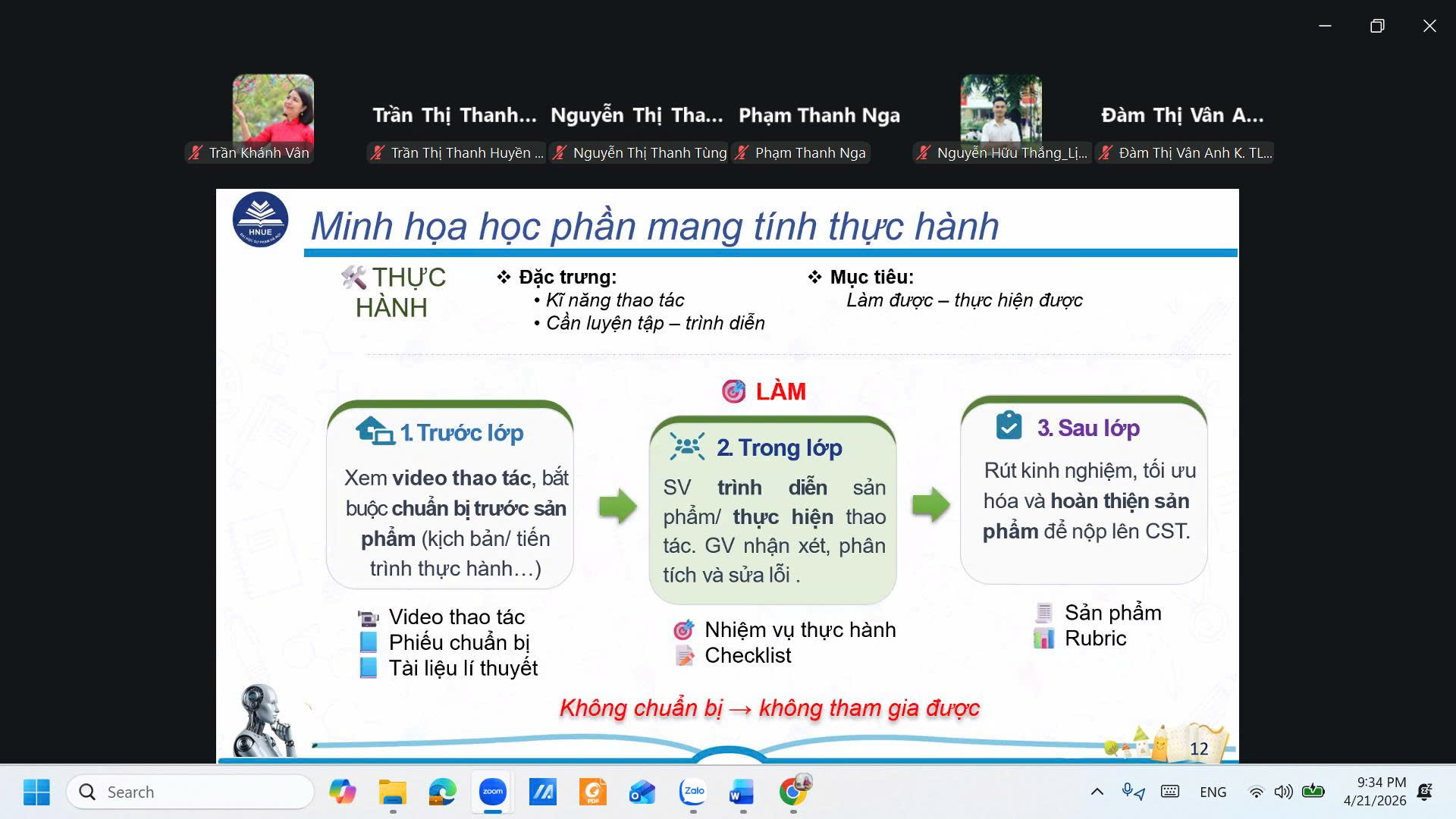 Đặc biệt, với những học phần mang tính thực hành, báo cáo viên cũng chia sẻ thêm cách tổ chức học liệu theo tiến trình trước - trong - sau buổi học, cũng như việc sử dụng video hướng dẫn để hỗ trợ sinh viên chuẩn bị trước khi lên lớp. Đây là hướng tiếp cận có ý nghĩa quan trọng trong việc phát huy vai trò chủ động của người học, đồng thời tối ưu hóa thời lượng tương tác trực tiếp trên lớp.