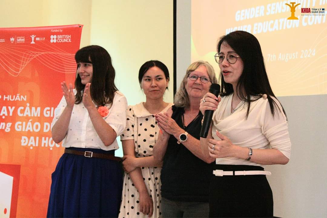 Trong các ngày 5,6,7/8/2024, Khoa Tâm lý - Giáo dục, Trường ĐHSP Hà Nội cùng Đại học Northampton và ĐH Salford, Vương quốc Anh tổ chức khóa tập huấn “Nhạy cảm giới trong giáo dục đại học” với sự tham gia của hơn 100 học viên là giảng viên, nghiên cứu sinh và học viên cao học, sinh viên của các khoa Tâm lý Giáo dục, khoa Công tác xã hội (Trường ĐHSP Hà Nội) và cán bộ của các cơ quan, đơn vị ngoài trường. Khóa tập huấn đã diễn ra thành công với sự đồng hành của các diễn giả PGS.TS. Ecem Karlidag-Dennis (ĐH Northampton - Vương Quốc Anh), ThS. Nichola Heaton (ĐH Salford - Vương Quốc Anh), ThS. Đàm Thị Vân Anh (ĐHSP Hà Nội) cùng ThS. Trần Thị Thanh Tâm - đại diện đến từ UNESCO Việt Nam.