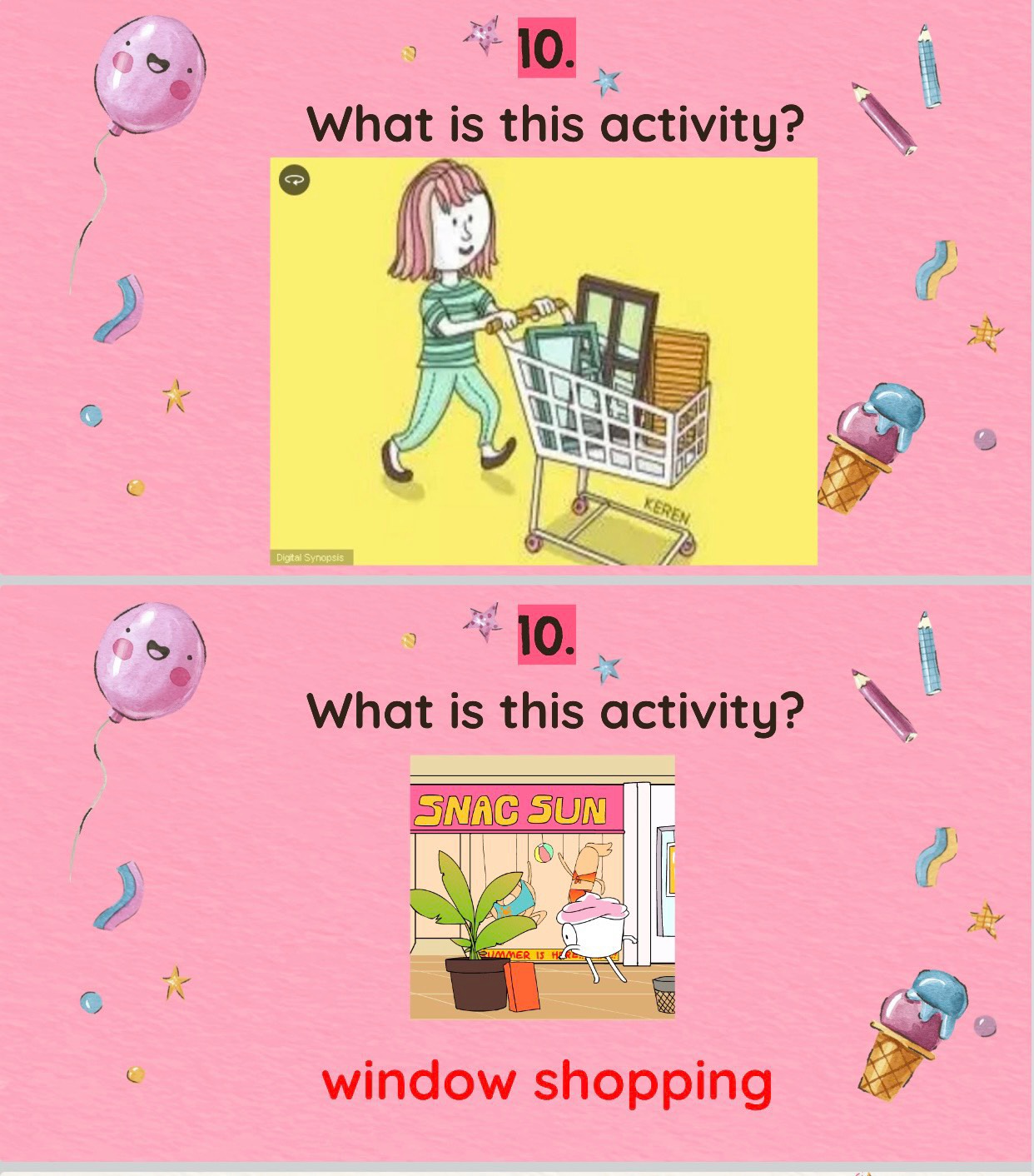 Phần ba của chương trình BÉ F.O.E. THÔNG THÁI nối tiếp với 15 câu hỏi đố vui nâng dần độ khó thực sự là phần chơi dành cho các cháu từ lứa tuổi mầm non cho tới các cháu học các lớp cuối bậc trung học cơ sở cũng phải vắt óc tìm ra đáp án hoặc câu trả lời đúng. Với những câu hỏi đan xen vừa đố vui cho các cháu bé tuổi tiểu học và mẫu giáo như các cháu Trung Kiên, Ngọc Quyên con của mẹ Chu Huyền cũng trả lời được như câu đố vui về hạt mưa: “Cũng gọi là hạt - Không cầm được đâu - Làm nên ao sâu - Làm nên hồ rộng - Đó là hạt gì?”. Các cháu như cháu Giang Lam con mẹ Cao Giang, Quang Thắng con của mẹ Phạm Vân Anh, Thuỷ Minh con của mẹ Thuỷ Hường, Linh Ngọc con của mẹ Kim Anh … không hổ danh là con của các bố, mẹ dạy tiếng Anh vì các cháu phát âm hay, ngữ điệu chính xác. Ví dụ khi phải tả một tranh động với các hình ảnh chuyển động rất là nhanh và phải kể tên hành động trong tranh là gì (“What is this activity?”) và các cháu đã bật ra ngay tức thì: “Dạo qua các gian hàng chỉ ngắm mà không mua gì”( Window shopping).