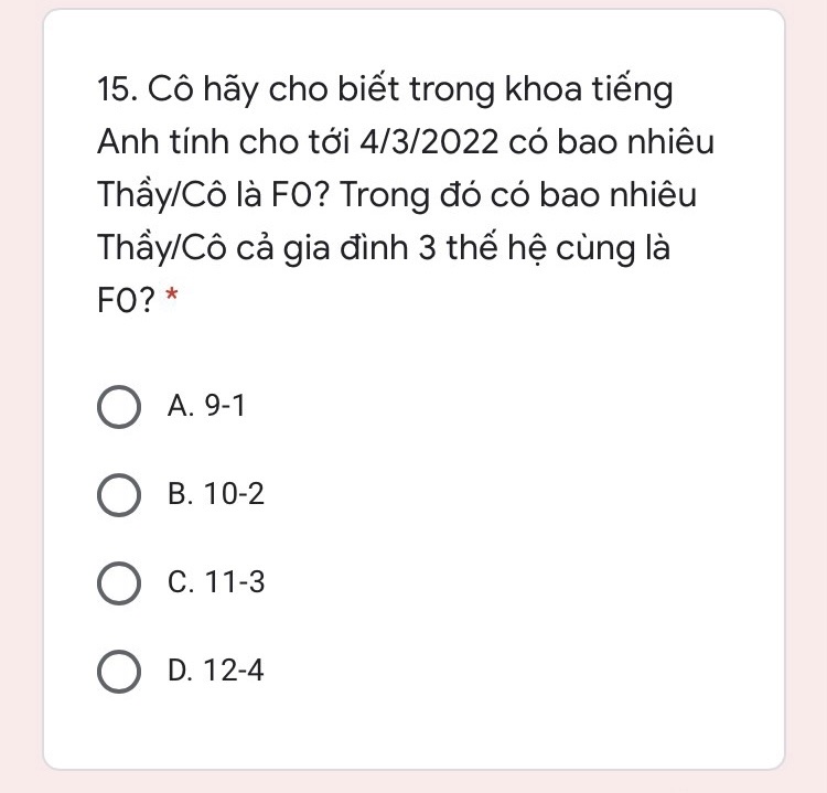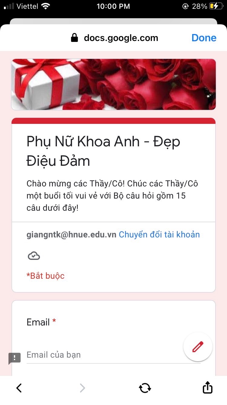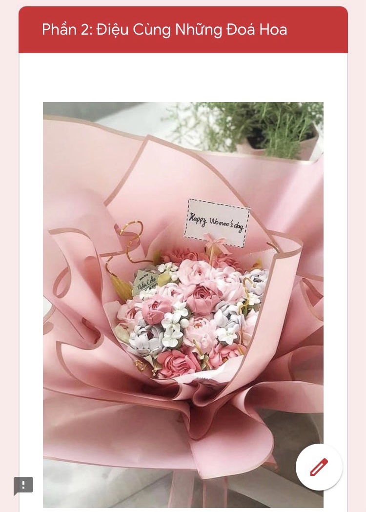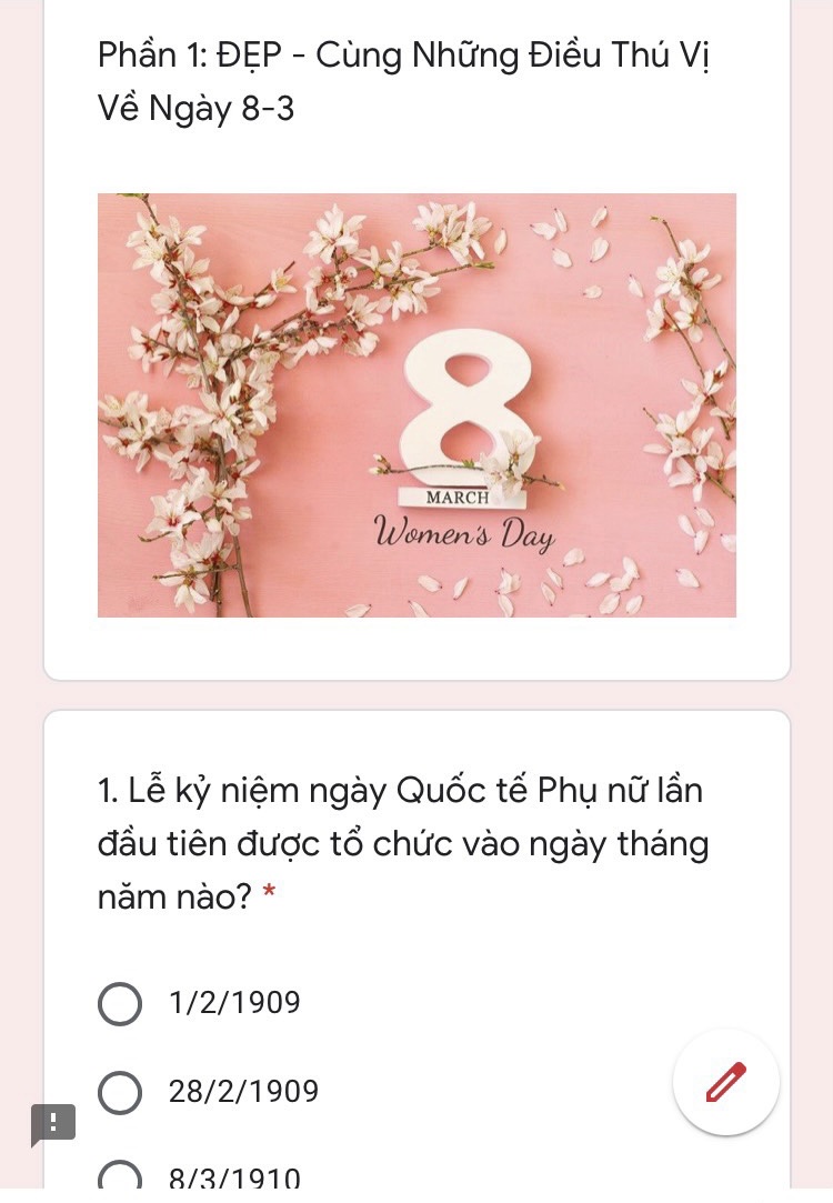 Phần ba của chương trình 8/3 năm 2022 với tiêu đề Phụ nữ Khoa Anh Đẹp - Điệu - Đảm thực sự là phần được các cô giáo của Khoa tiếng Anh mong chờ nhất và thu hút được đông đảo thí sinh nhất. Ban tổ chức đã soạn một bài thi qua Google Form với 15 câu hỏi trắc nghiệm được chia ra 3 phần: Phần đầu gồm 5 câu hỏi về nét đẹp tri thức của thí sinh qua những câu hỏi về lịch sử, truyền thống ngày 8/3 ở Việt Nam cũng như trên toàn thế giới. Phần hai gồm 5 câu hỏi về sự duyên dáng điệu đà của người phụ nữ qua kiến thức về những am hiểu, xử lý các loài hoa khác nhau. Có những câu hỏi mà chỉ những cô nào thực sự hiểu về loại hoa điệu đàng nhất trong các loài hoa mới có thể chọn đúng được đáp án như câu số 8: “Loài hoa ly kép nào dưới đây có cánh trắng viền hồng đặc trưng? A- Loài ly kép aisha; B- Loài ly kép anouska; C- Loài ly kép isabella; D- Loài ly kép viola”. Phần 3 gồm 5 câu hỏi thể hiện sự đảm đang của những cô gái, người vợ hay người mẹ khi các thí sinh chọn những đáp án đúng khi được hỏi về đại dịch Covid. Các câu hỏi đòi hỏi sự hiểu biết sâu rộng và thực tế và đi kèm những thuật ngữ y học mà phải là những ai có quan tâm hoặc trong cuộc chiến chống dịch thực sự mới biết như chỉ số độ bão hoà ô xy trong máu ngoại vi -SpO2, các triệu chứng sau Covid, các tư thế nằm, hay tập thở mà bác sỹ hướng dẫn. Lồng ghép trong đó còn có con số thể hiện sự quan tâm của mỗi cá nhân với tập thể và đồng nghiệp như câu hỏi số 15: ”Cô hãy cho biết trong khoa tiếng Anh tính tới ngày 4/3/2022 có bao nhiêu Thầy/Cô là F0? Trong đó có bao nhiêu Thầy/Cô cả gia đình 3 thế hệ cùng là F0?”. Ban tổ chức thông báo đúng 8 giờ tối 4/3/2022 sẽ mở link để các thí sinh vào trà lời câu hỏi của phần thi mà các thí sinh đã hào hứng đợi chờ từ 6, 7 giờ tối và chỉ sau 1 giờ các cô đã vào dự thi xong. Trong khi đợi tới giờ ban tổ chức công bố kết quả là cả một thời gian các thí sinh hồi hộp đợi chờ kết quả với những thảo luận, bàn tán sôi nổi về bài thi. Và kết quả chung cuộc với giải Nhất thuộc về cô Đỗ Thị Phương Mai, giải Nhì là cô Cù Thị Thu Thuỷ, hai cô giáo rinh giải Ba là các cô Cao Thị Thu Giang và Hồng Minh Nguyệt, còn lại là 20 giải Khuyến khích. Giải thưởng được trao liền ngay sáng 5/3 và ai cũng rạng rỡ với những món quả tuy nhỏ nhưng là cơ hội để các cô giáo trong khoa được thử sức mình, để cùng bên nhau nói cười rộn rã, cùng nhau vượt mọi khó khăn dù đại dịch có căng thẳng tới đâu, dù có vất vả tới mấy để làm tròn trách nhiệm của người giáo viên, người vợ, người mẹ và hơn hết để khẳng định rằng các cô giáo Khoa tiếng Anh thật sự Đẹp - Điệu - Đảm!