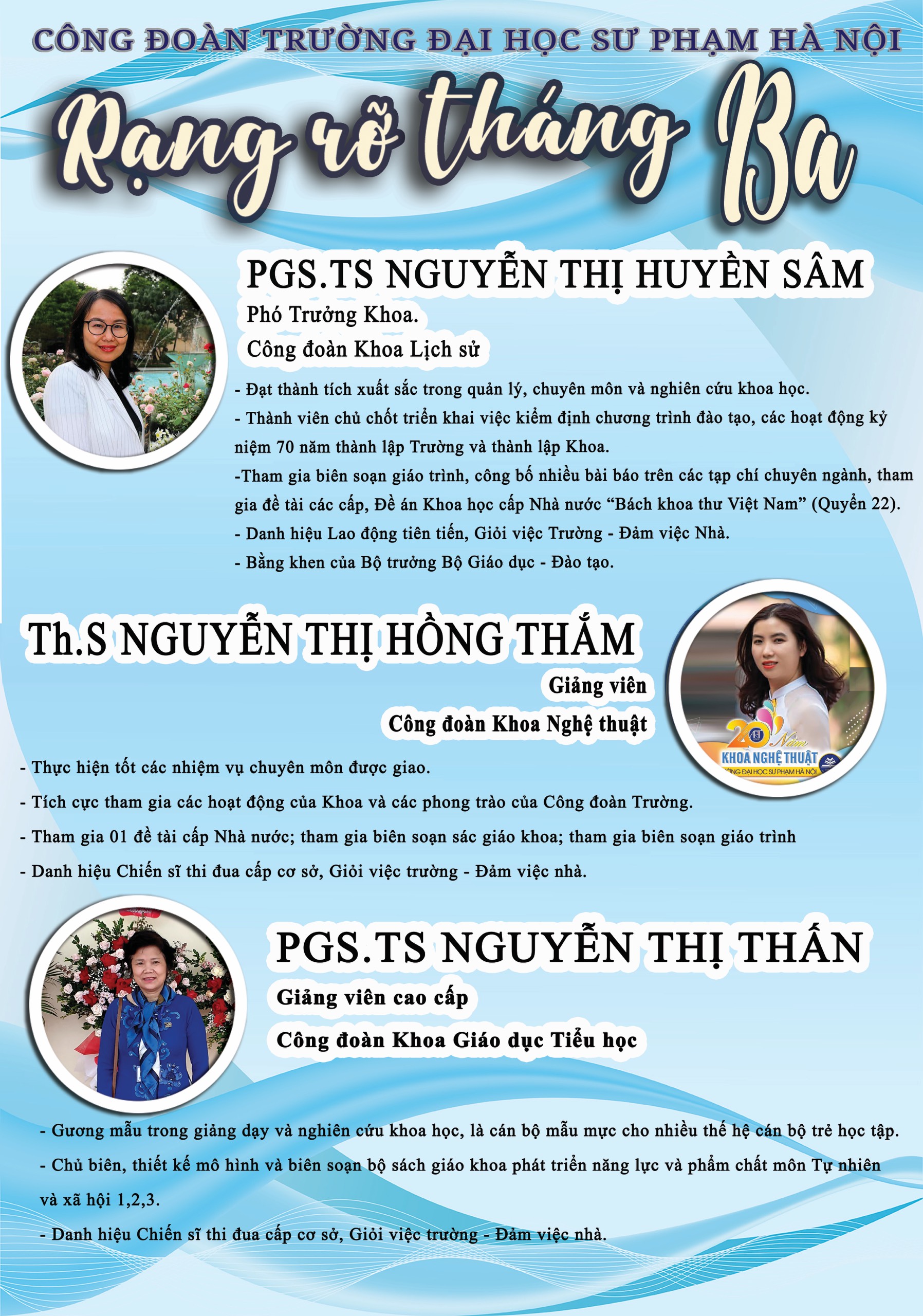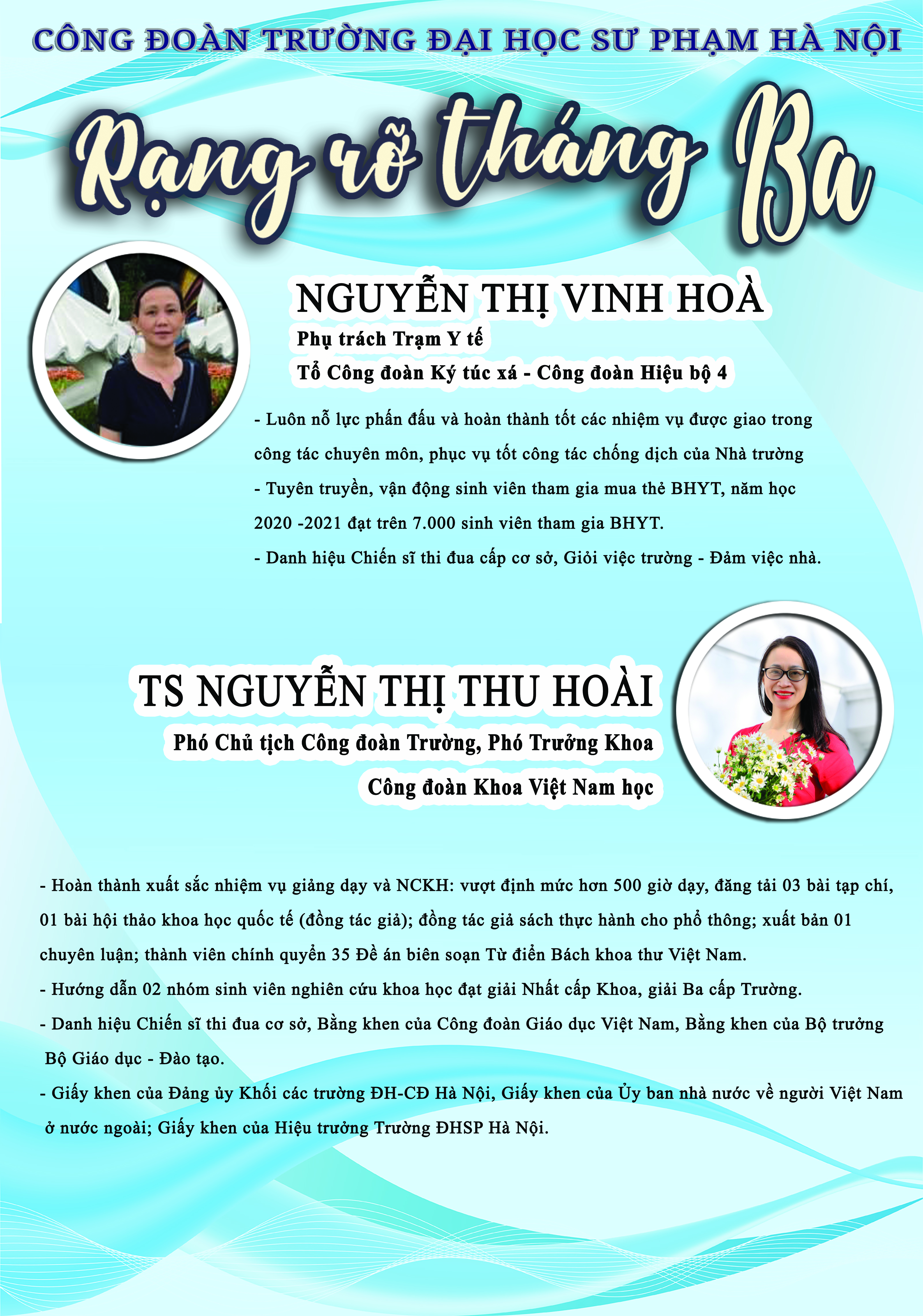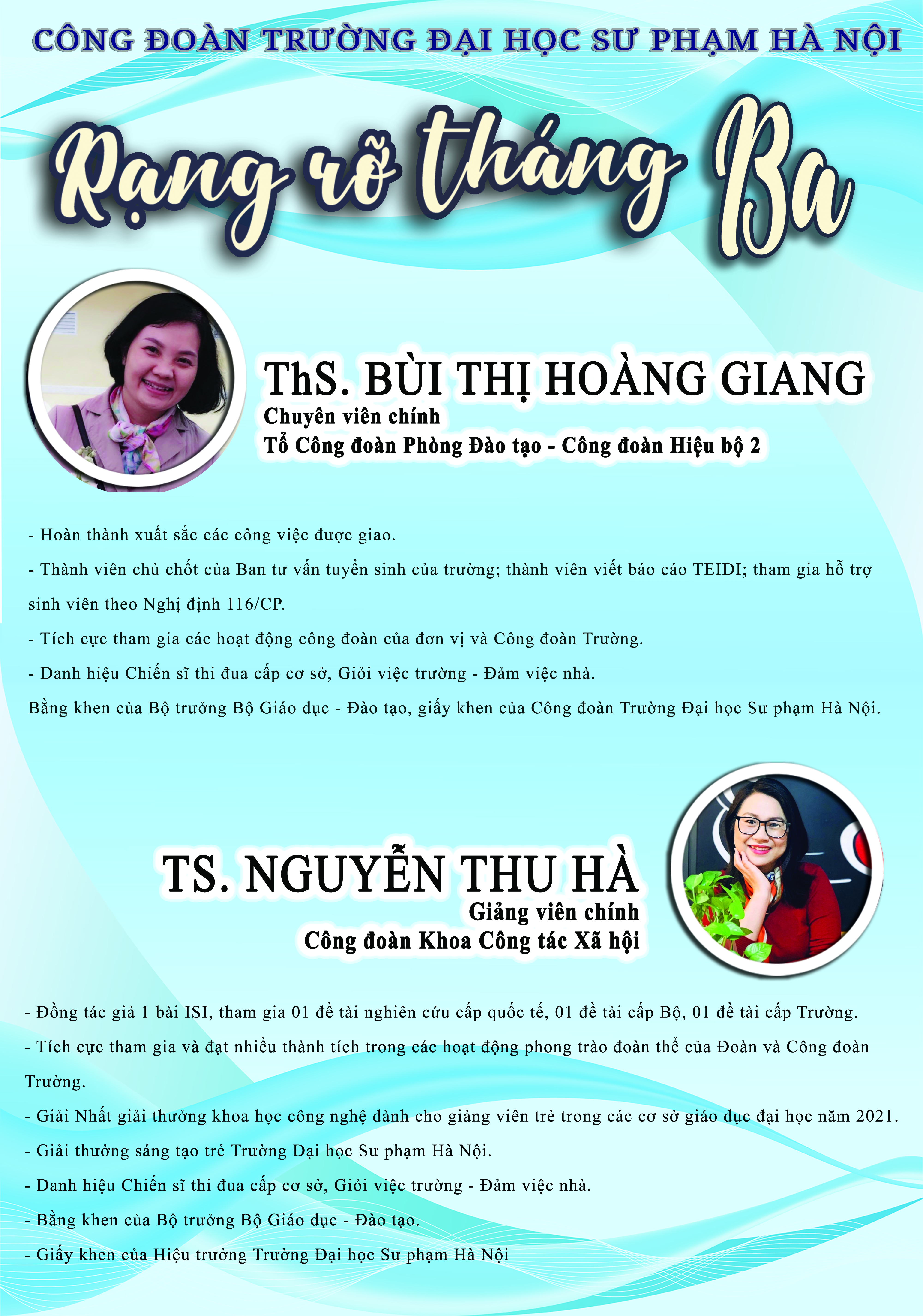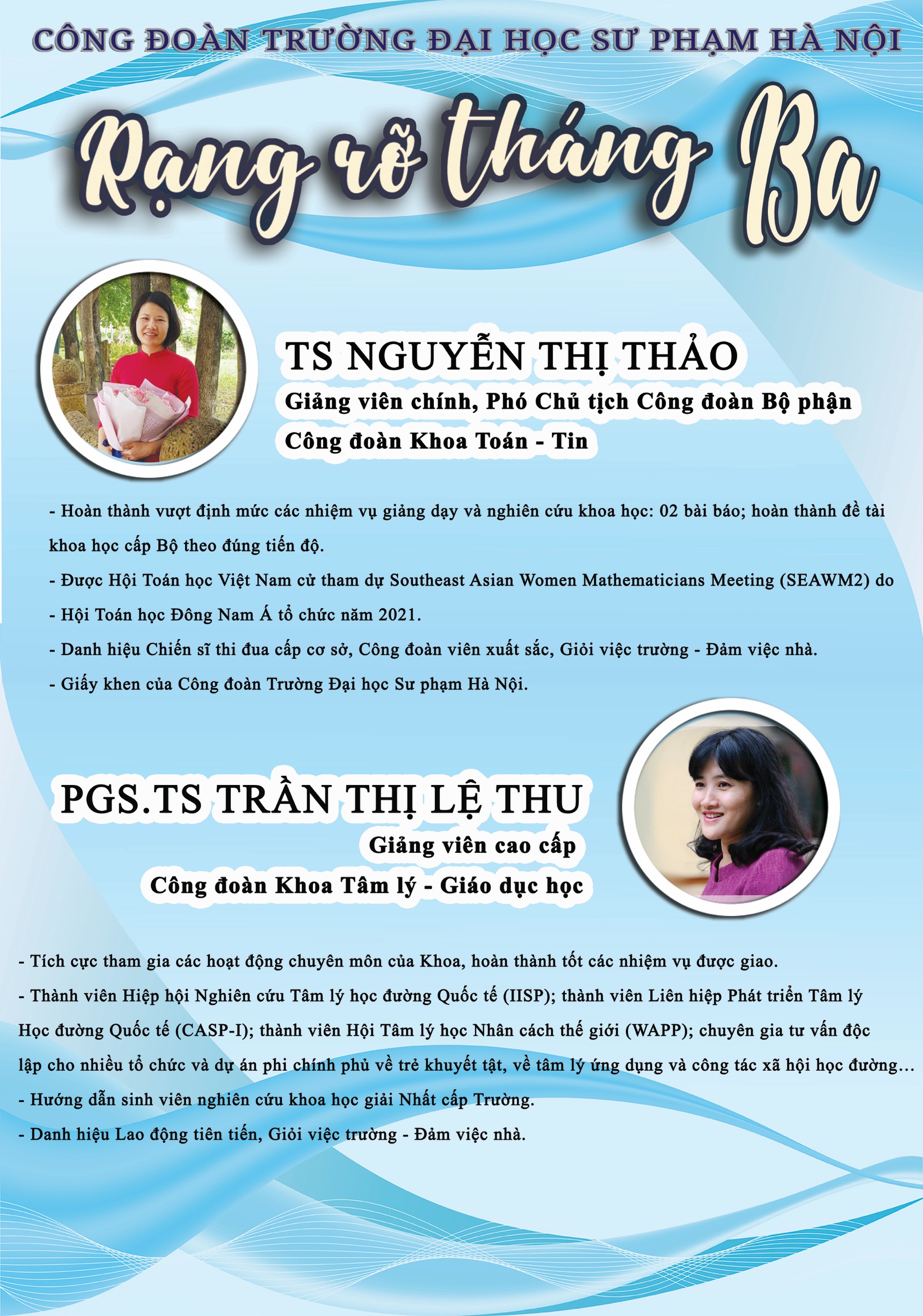 Thực hiện Kế hoạch công tác năm học học 2021 - 2022, nằm trong chuỗi các hoạt động chào mừng 112 năm ngày Quốc tế Phụ nữ 8/3/2022 và 1982 năm Khởi nghĩa Hai Bà Trưng, ngày Quốc tế Hạnh phúc 20 - 3, Công đoàn Trường Đại học Sư phạm Hà Nội tuyên dương và tặng Giấy khen cho 27 nữ cán bộ tiêu biểu năm 2021.