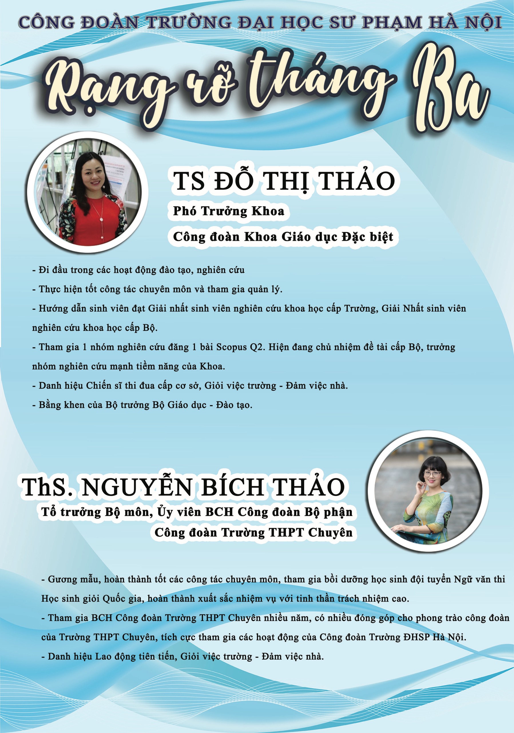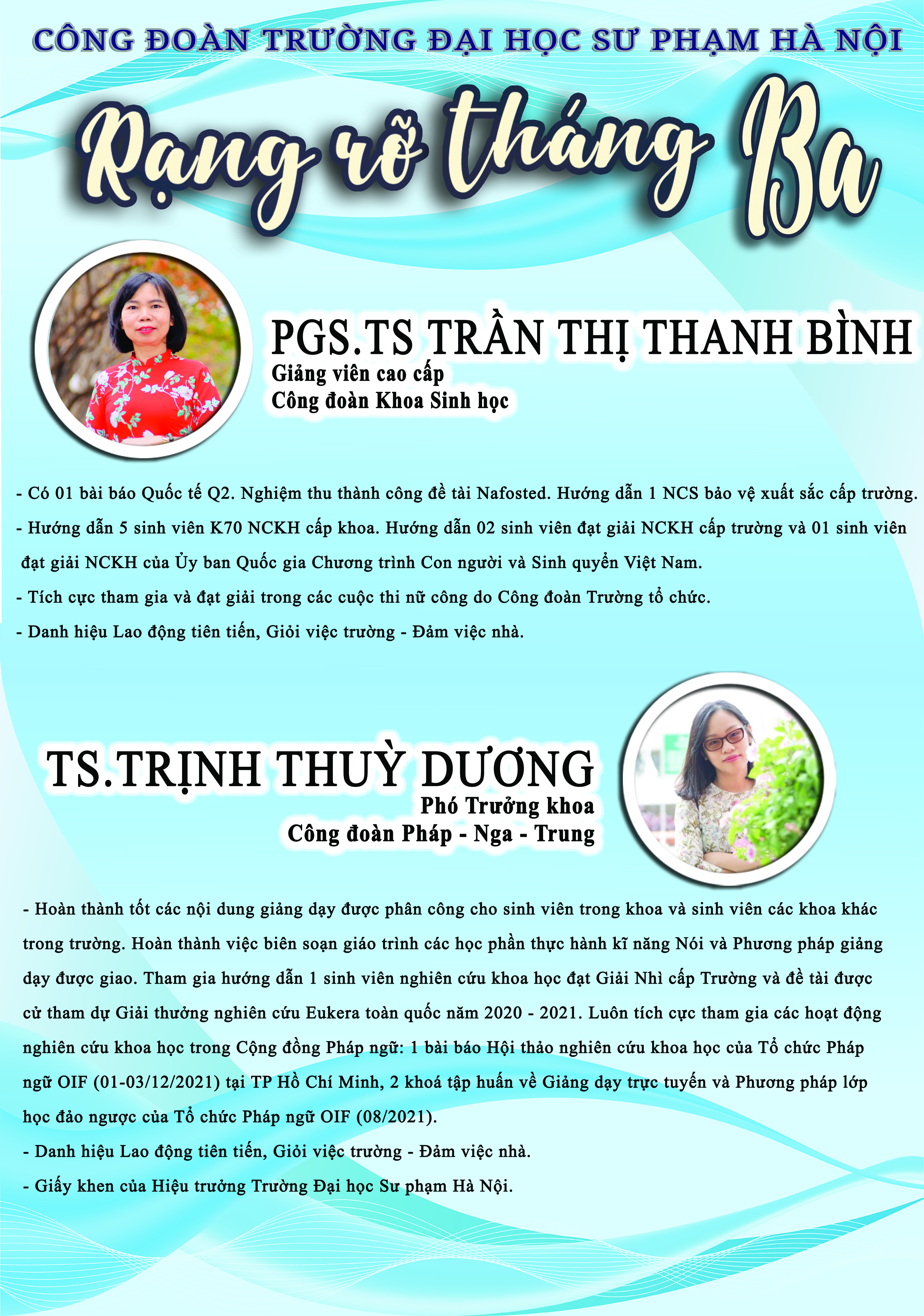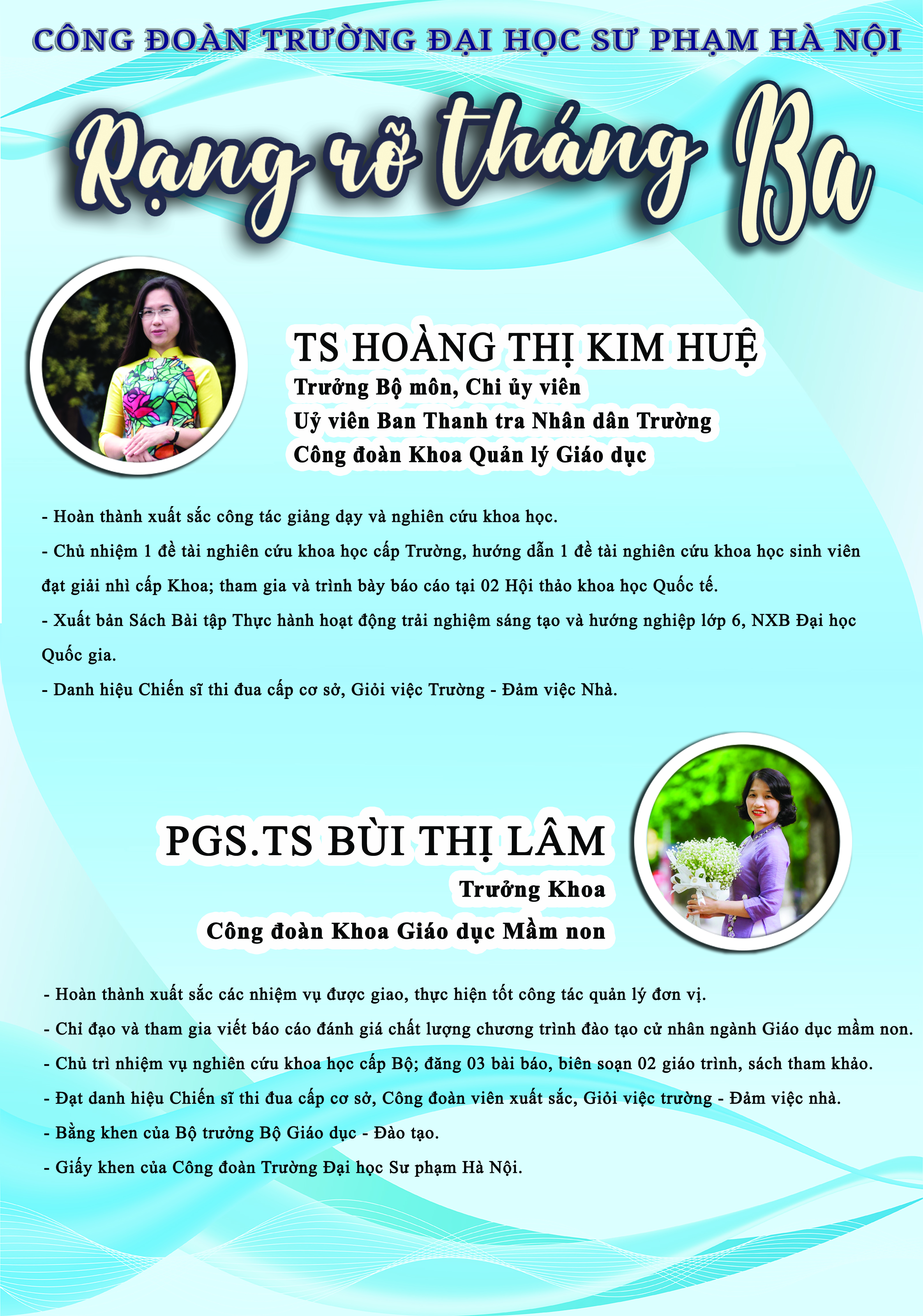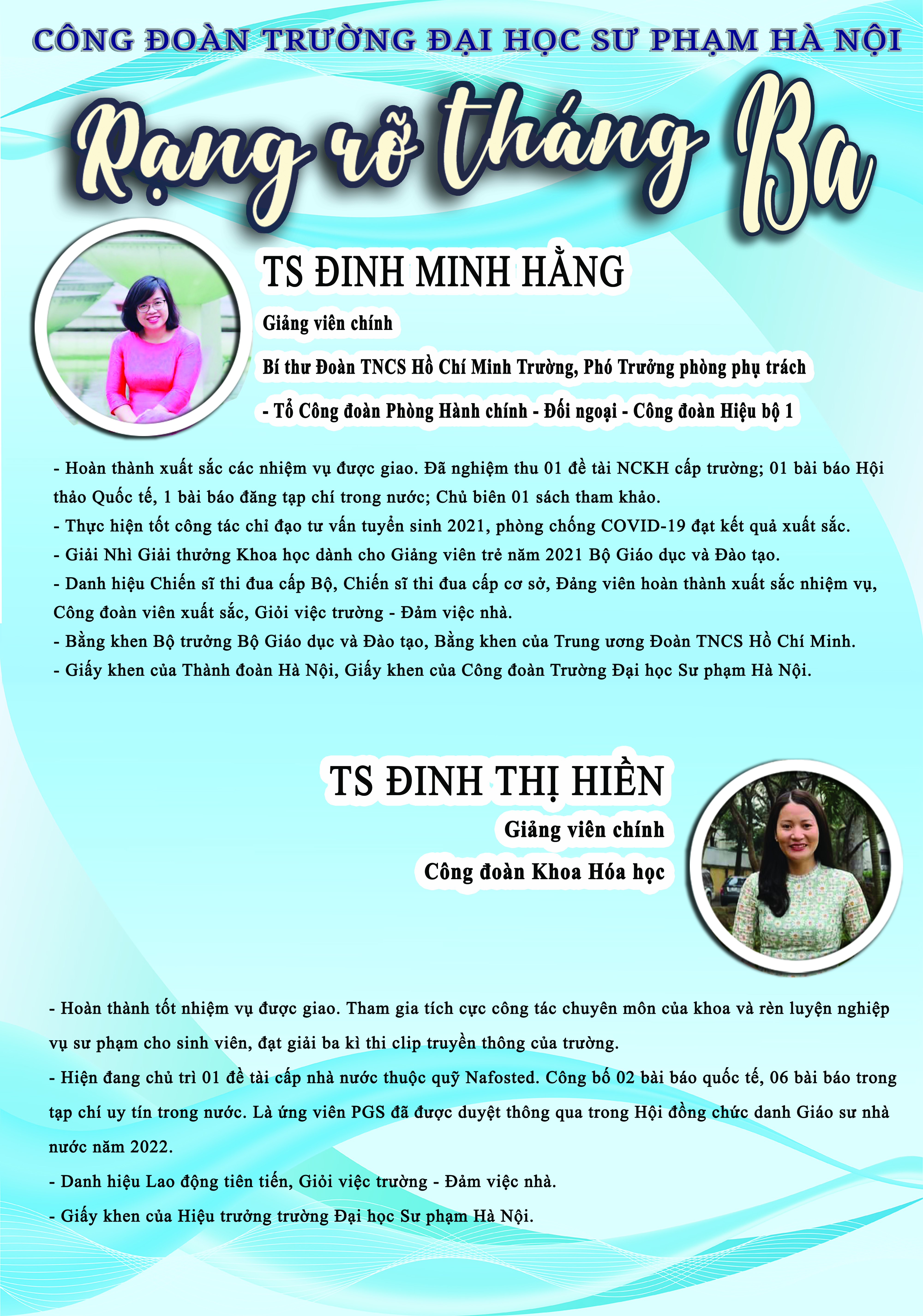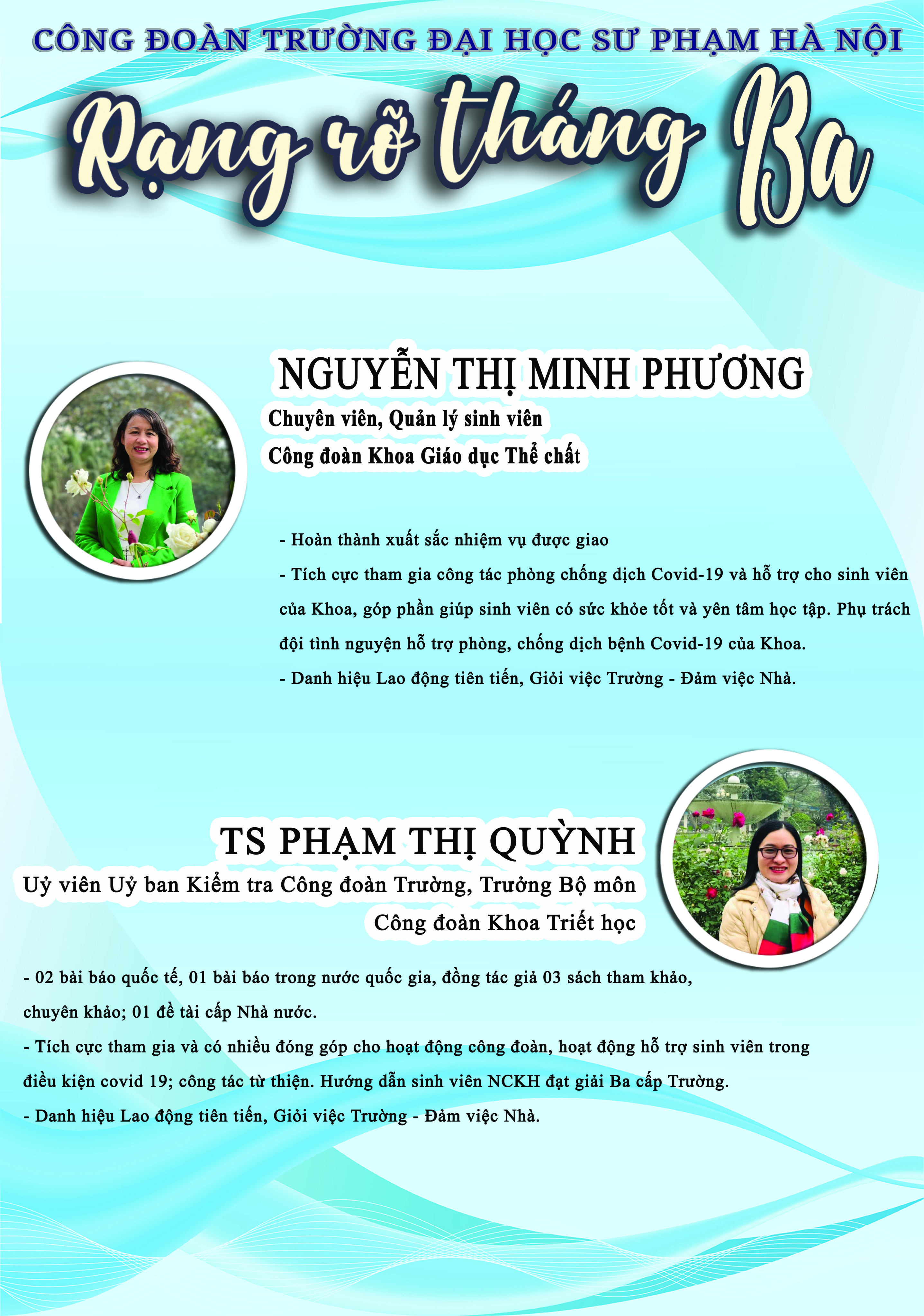 Thực hiện Kế hoạch công tác năm học học 2021 - 2022, nằm trong chuỗi các hoạt động chào mừng 112 năm ngày Quốc tế Phụ nữ 8/3/2022 và 1982 năm Khởi nghĩa Hai Bà Trưng, ngày Quốc tế Hạnh phúc 20 - 3, Công đoàn Trường Đại học Sư phạm Hà Nội tuyên dương và tặng Giấy khen cho 27 nữ cán bộ tiêu biểu năm 2021.