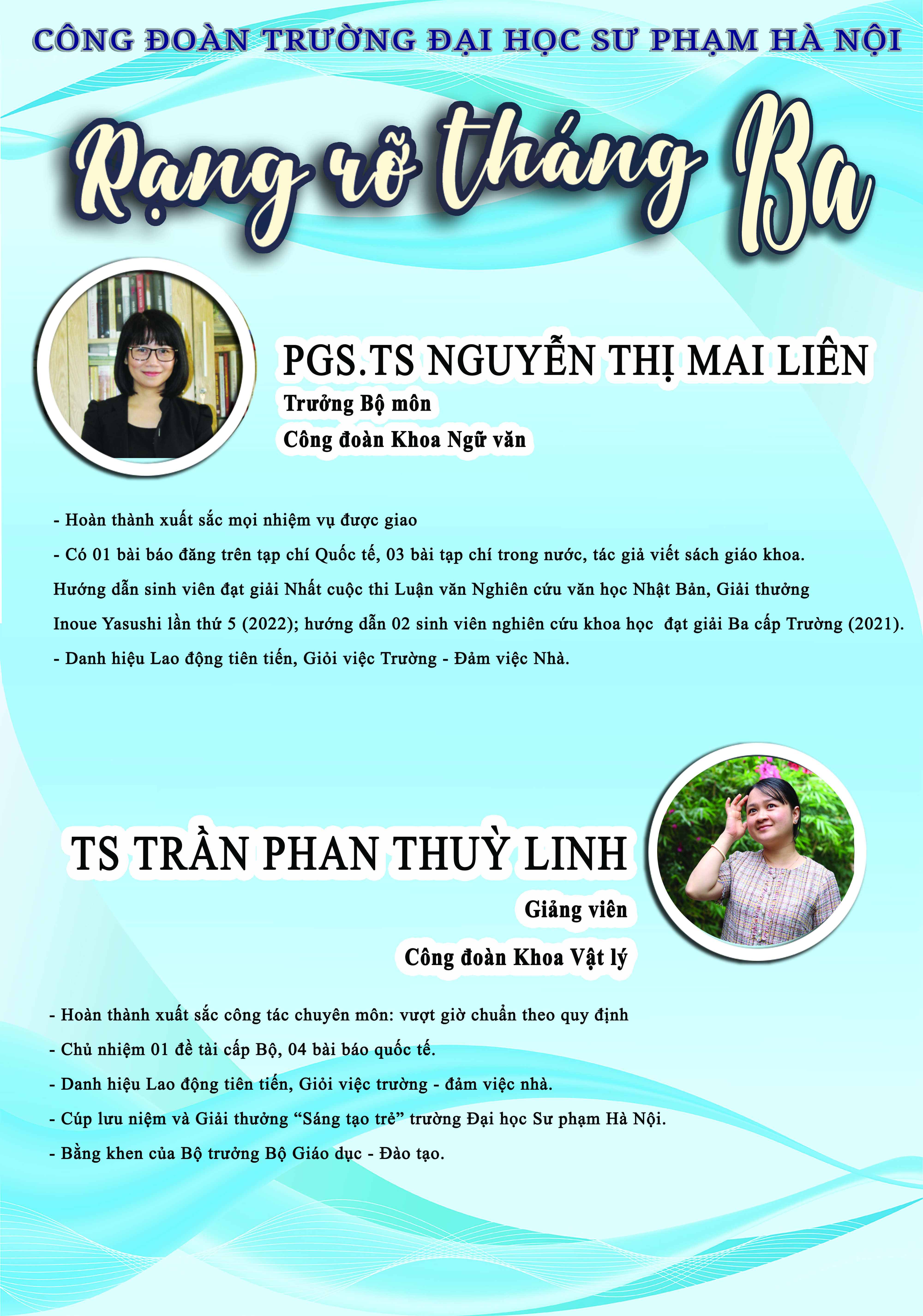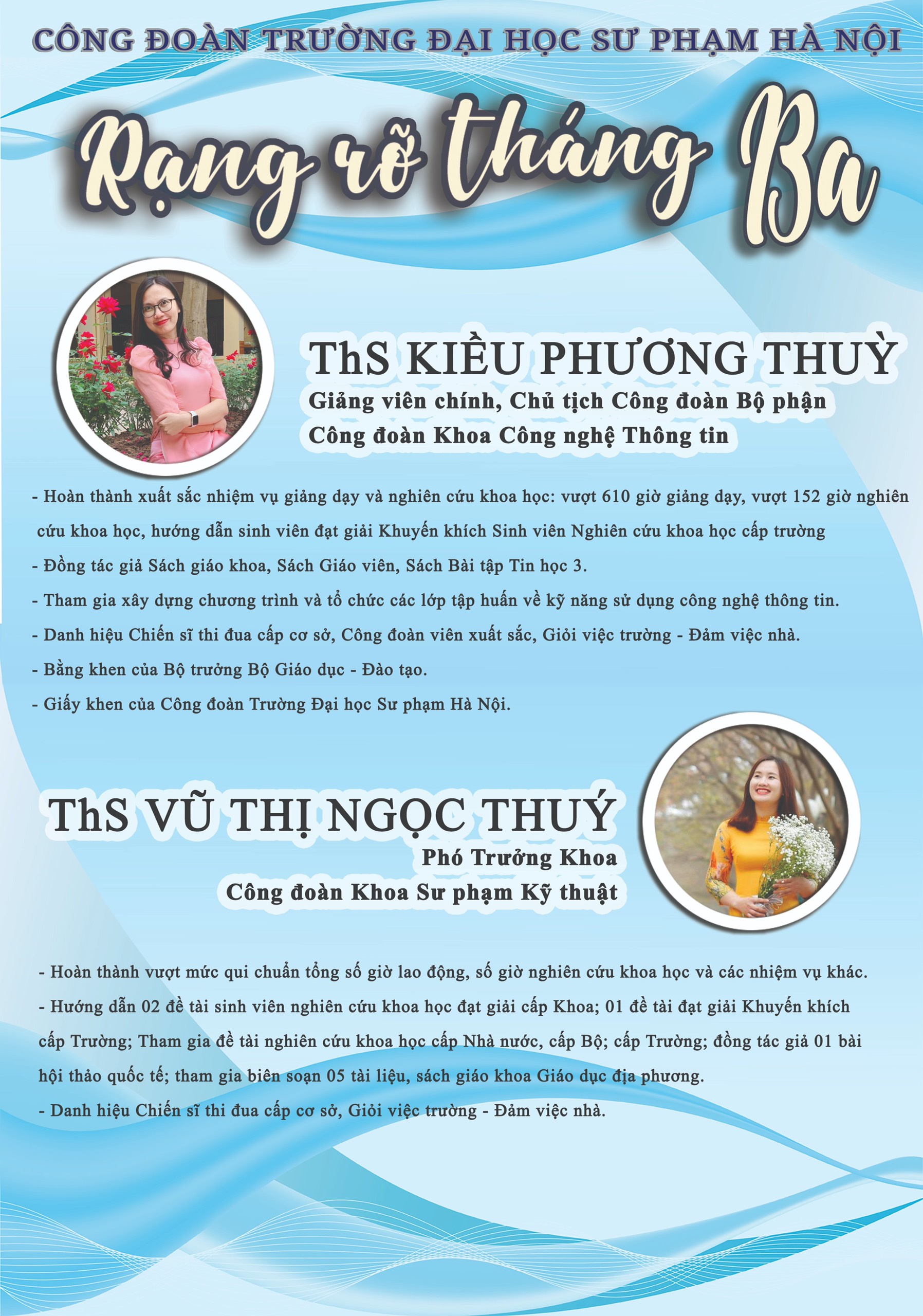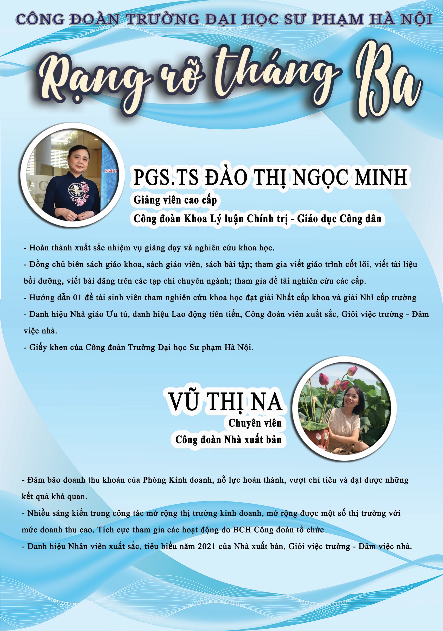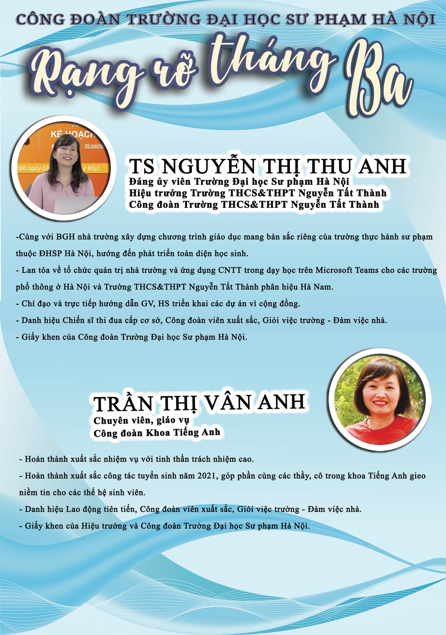 Thực hiện Kế hoạch công tác năm học học 2021 - 2022, nằm trong chuỗi các hoạt động chào mừng 112 năm ngày Quốc tế Phụ nữ 8/3/2022 và 1982 năm Khởi nghĩa Hai Bà Trưng, ngày Quốc tế Hạnh phúc 20 - 3, Công đoàn Trường Đại học Sư phạm Hà Nội tuyên dương và tặng Giấy khen cho 27 nữ cán bộ tiêu biểu năm 2021.