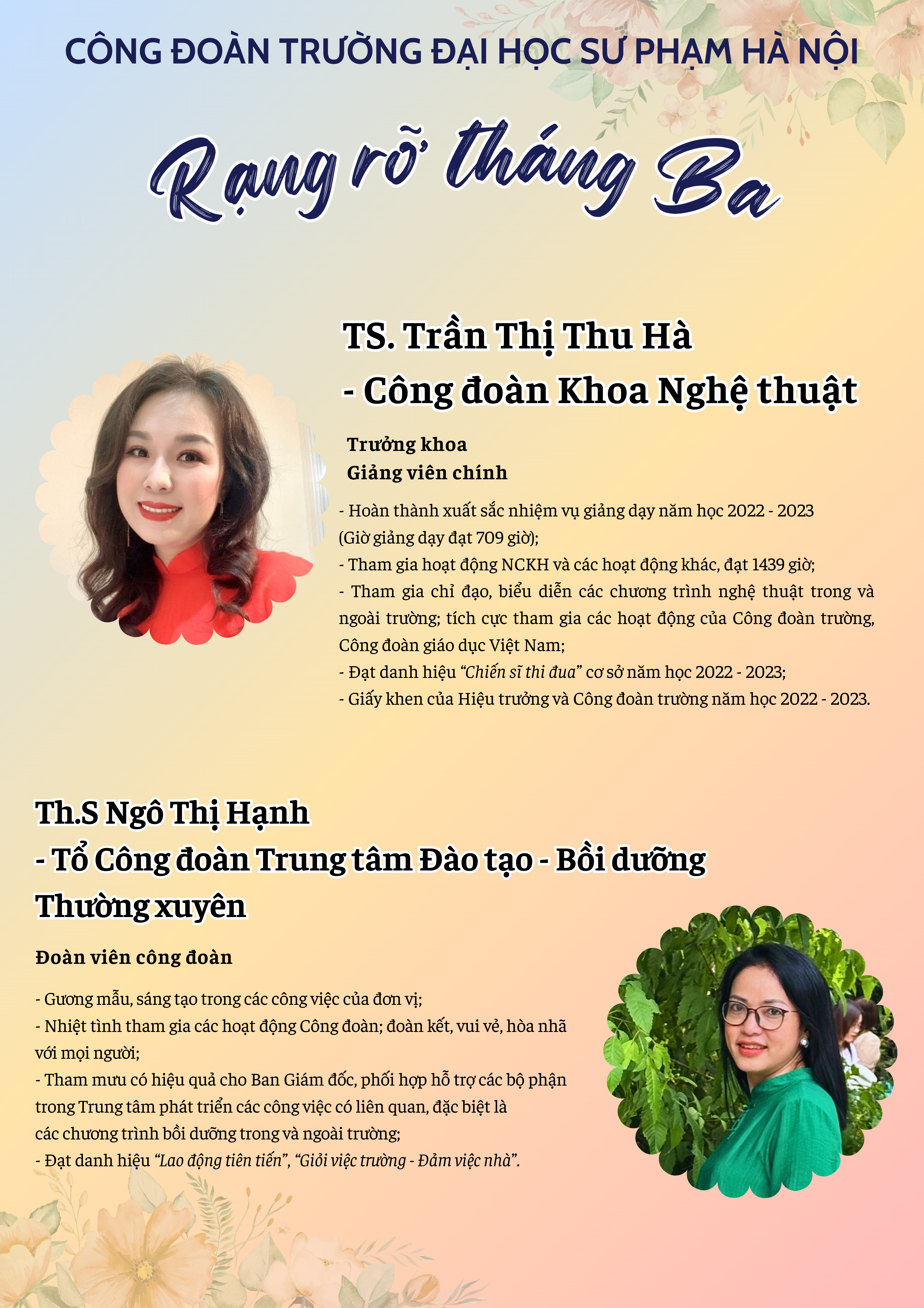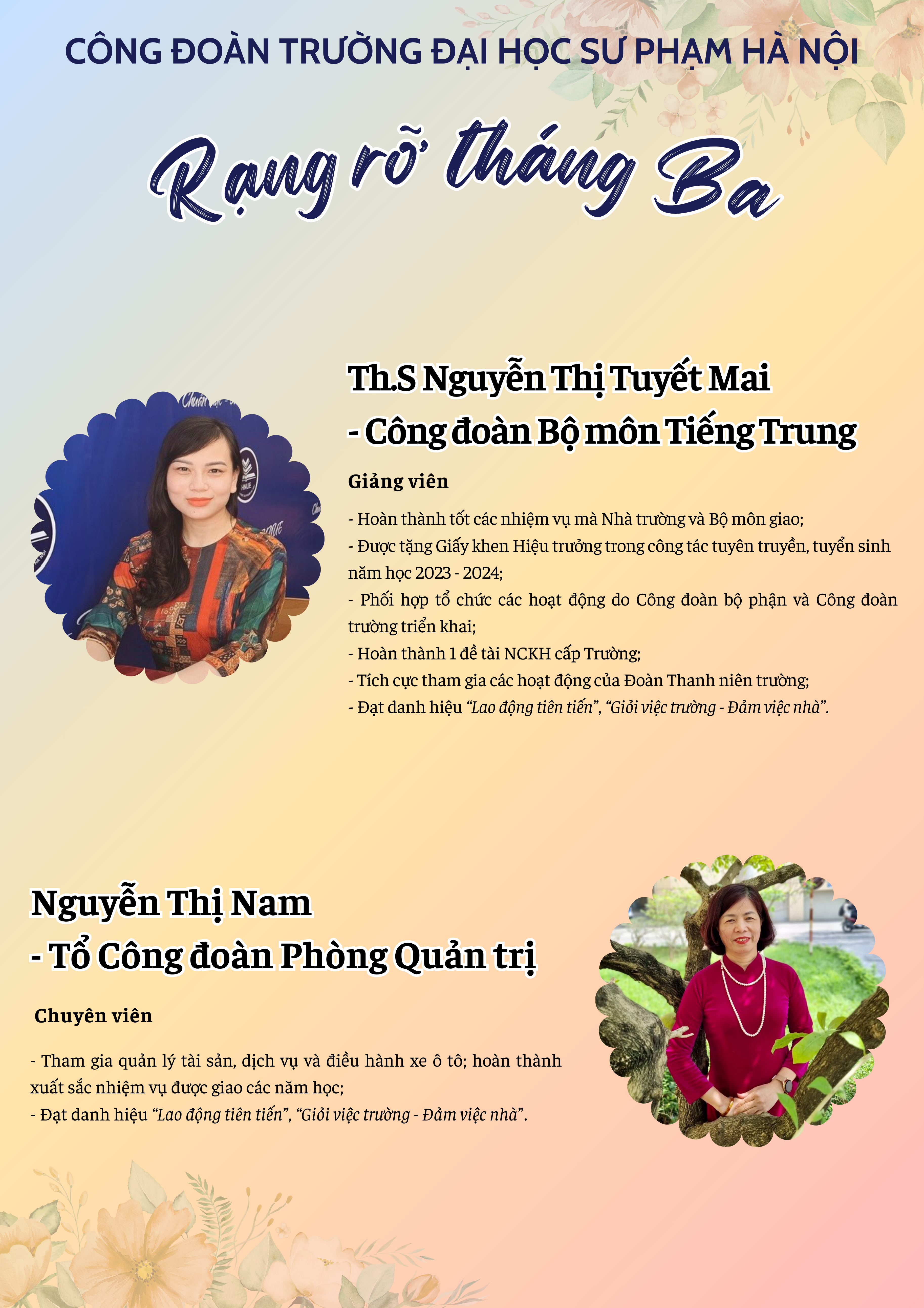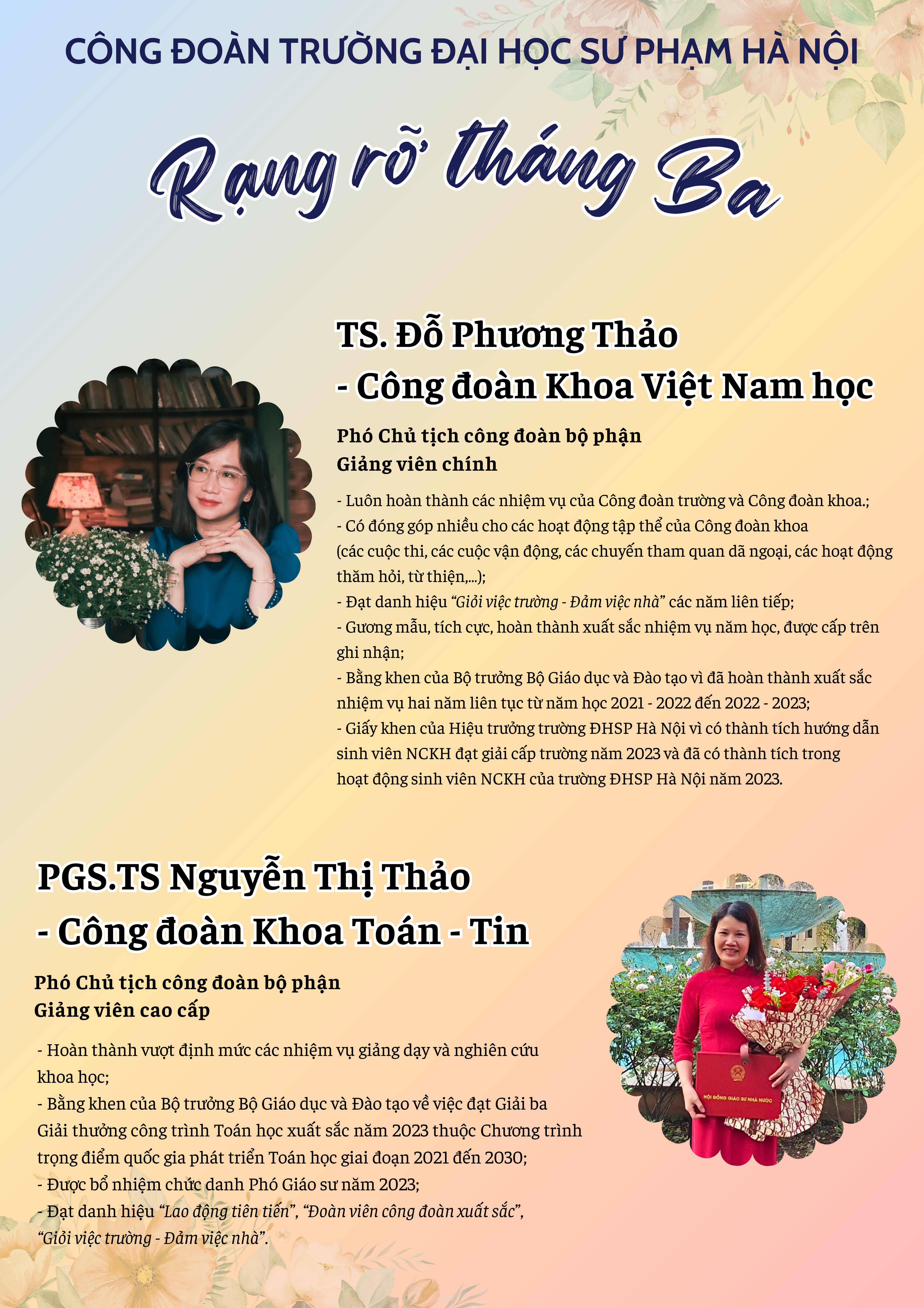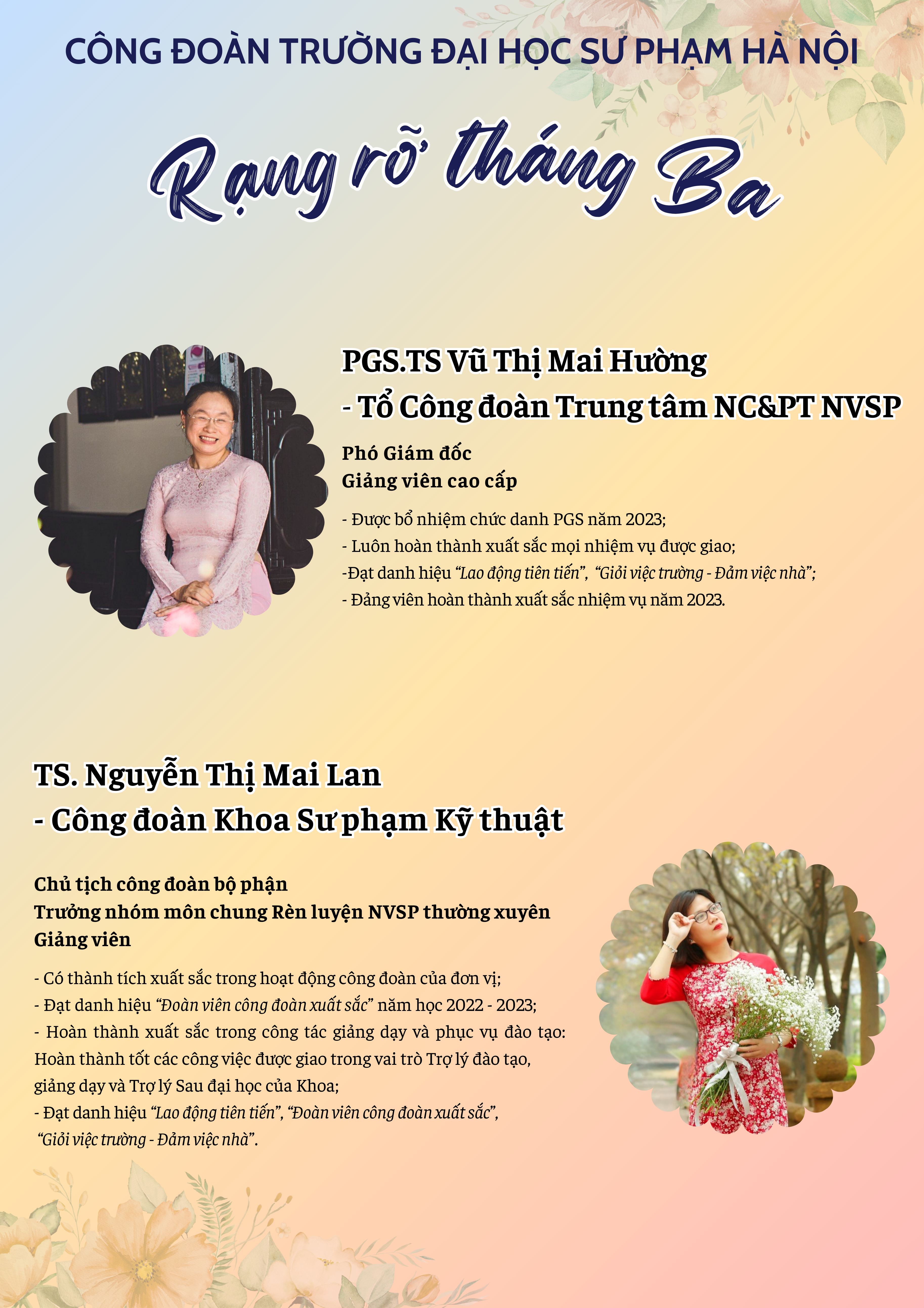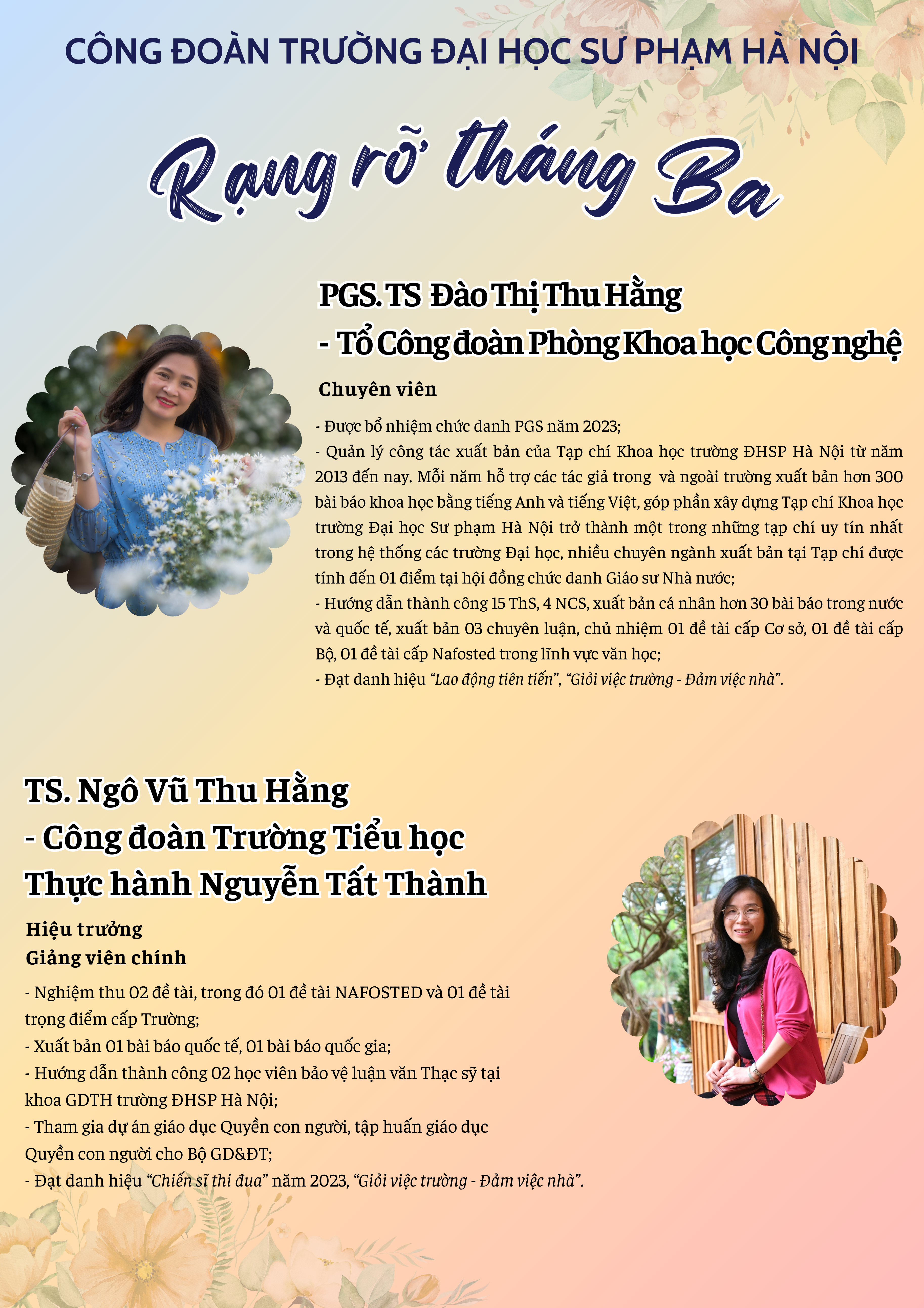 Nhân dịp chào mừng kỷ niệm 114 năm ngày Quốc tế Phụ nữ (8/3/1910 - 8/3/2024), Công đoàn Trường đã tổ chức chương trình "Rạng rỡ tháng Ba" năm 2024, tôn vinh nữ cán bộ, nhà giáo, người lao động tiêu biểu, đạt thành tích xuất sắc trong các lĩnh vực công tác chuyên môn, nghiên cứu khoa học, quản lý, phục vụ đào tạo và nữ cán bộ được phong học hàm Giáo sư, Phó Giáo sư năm 2023.