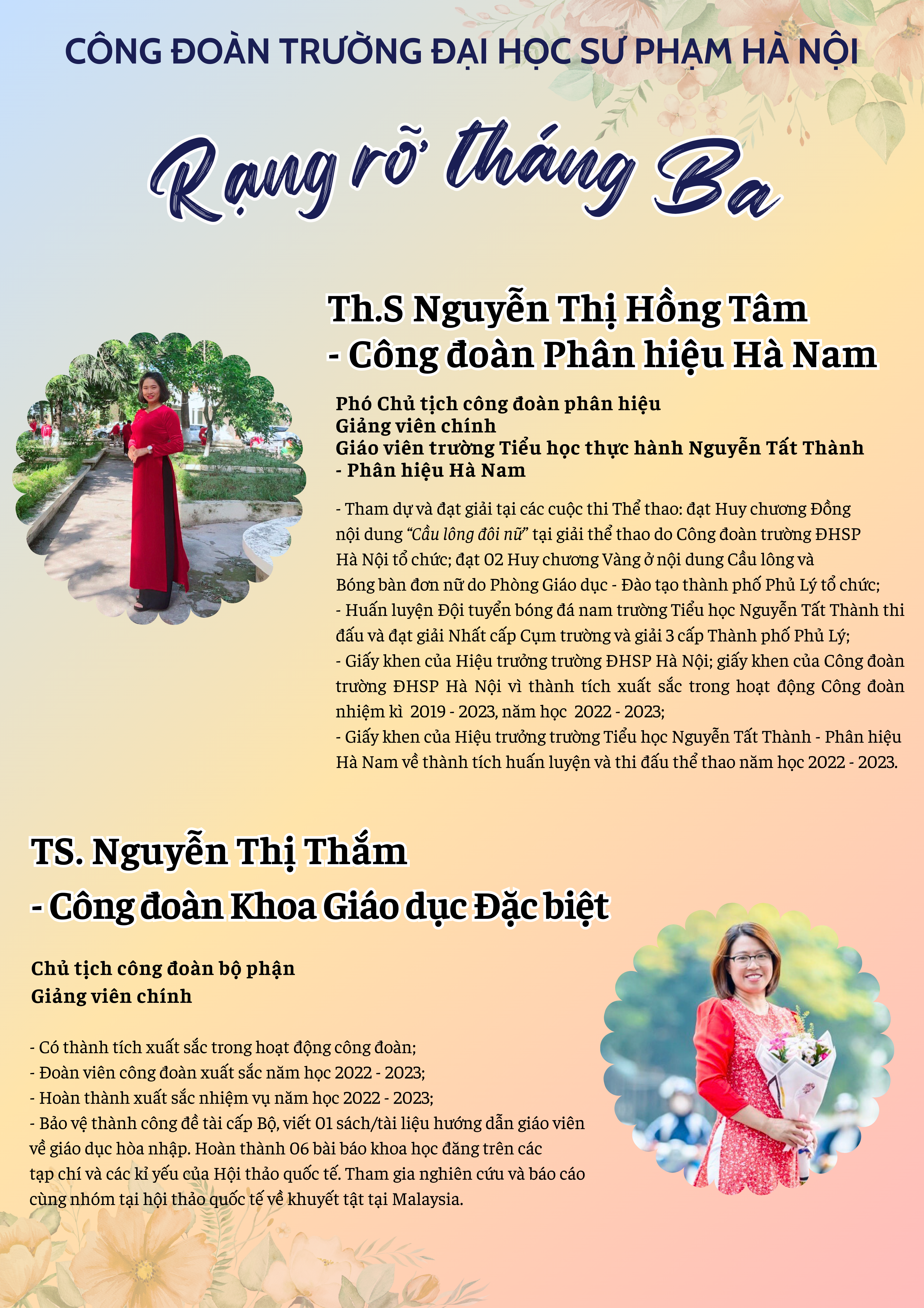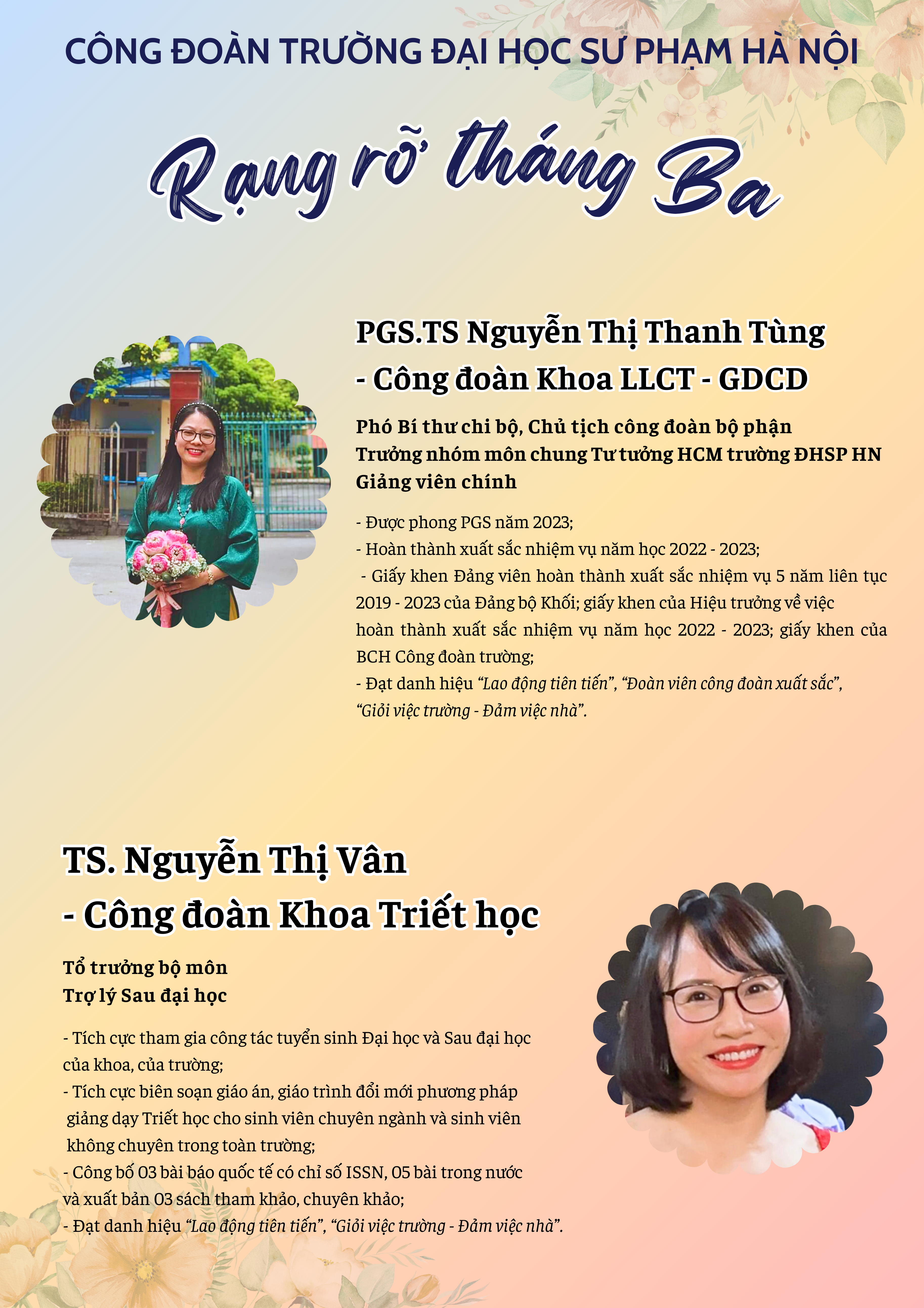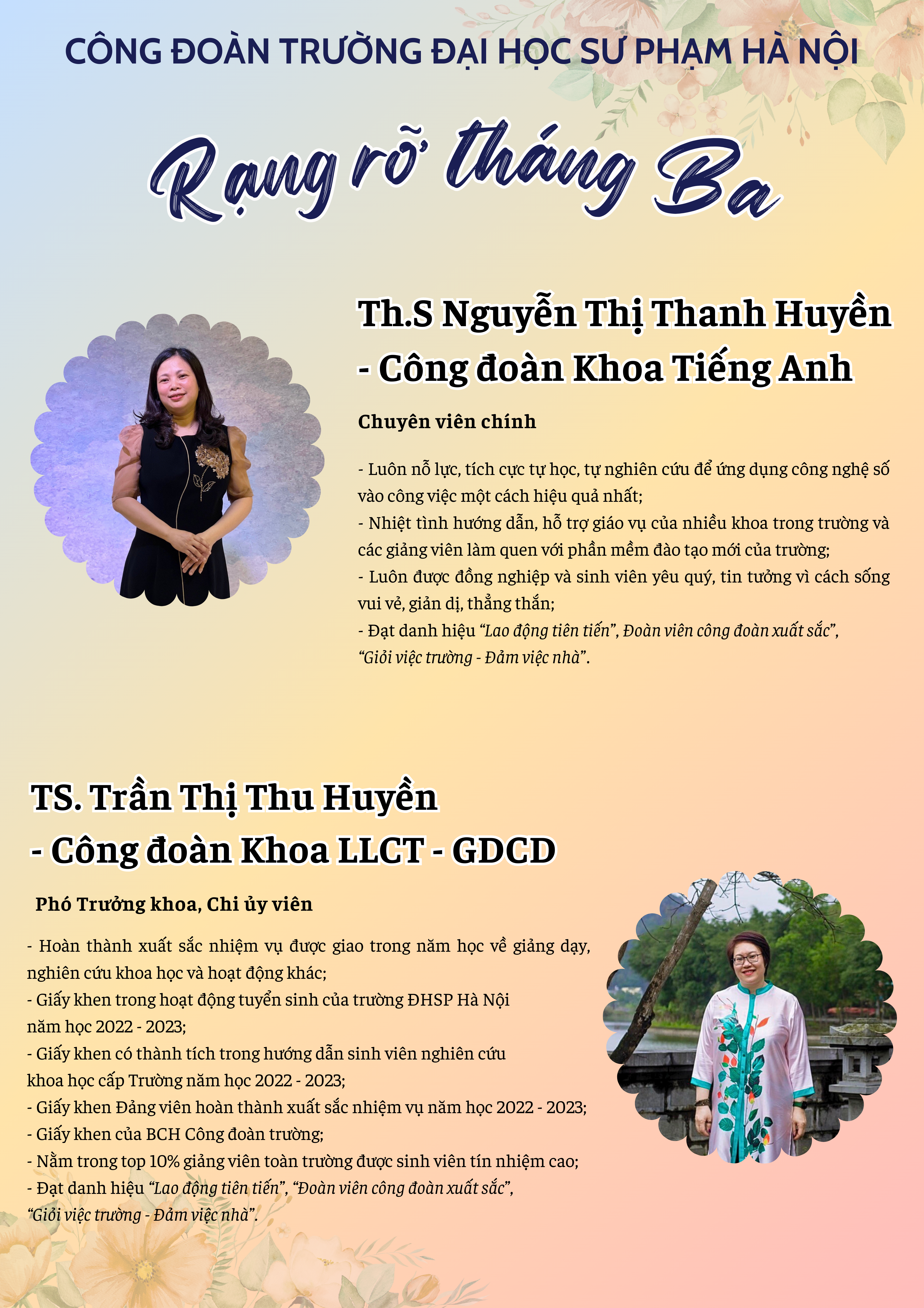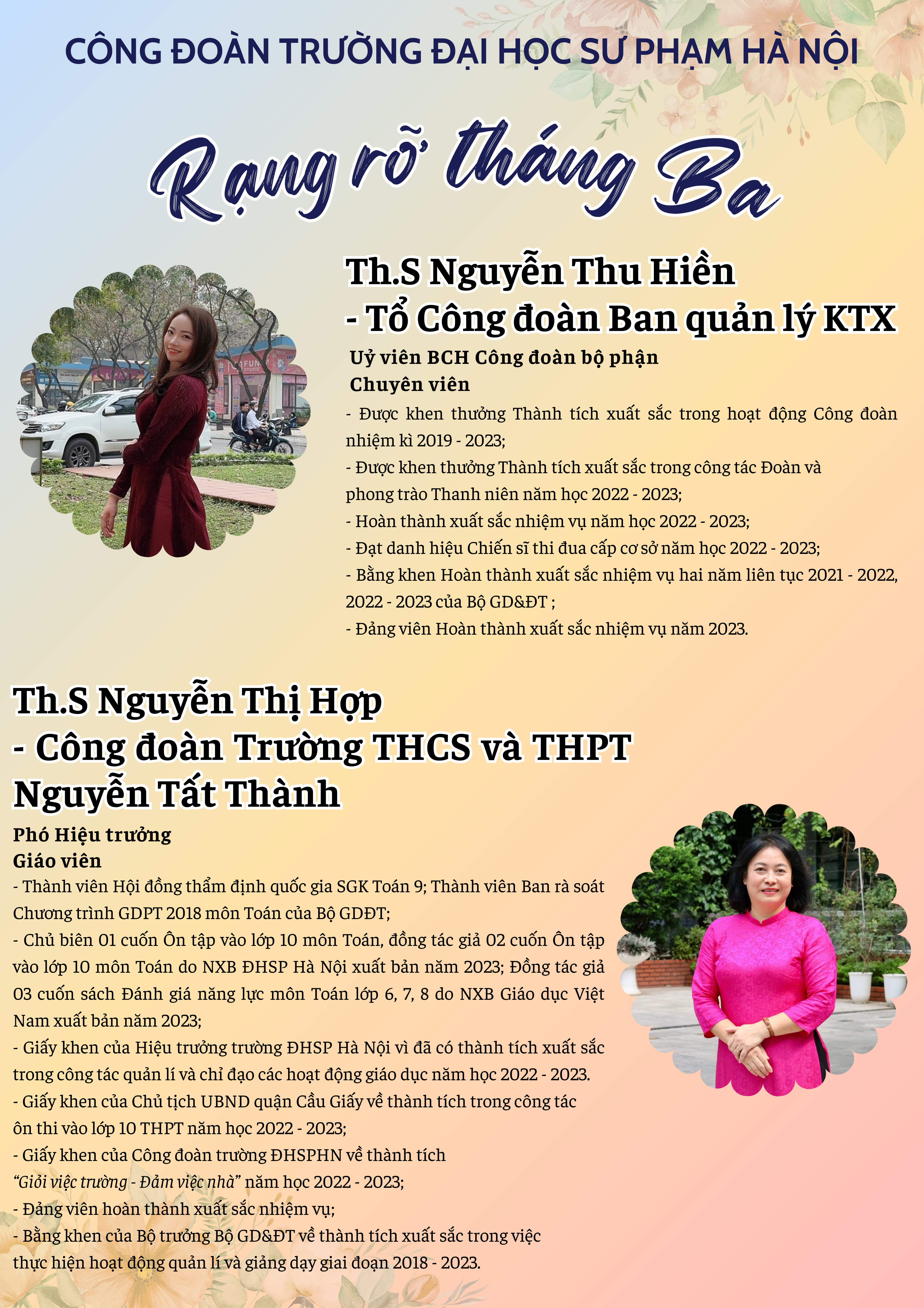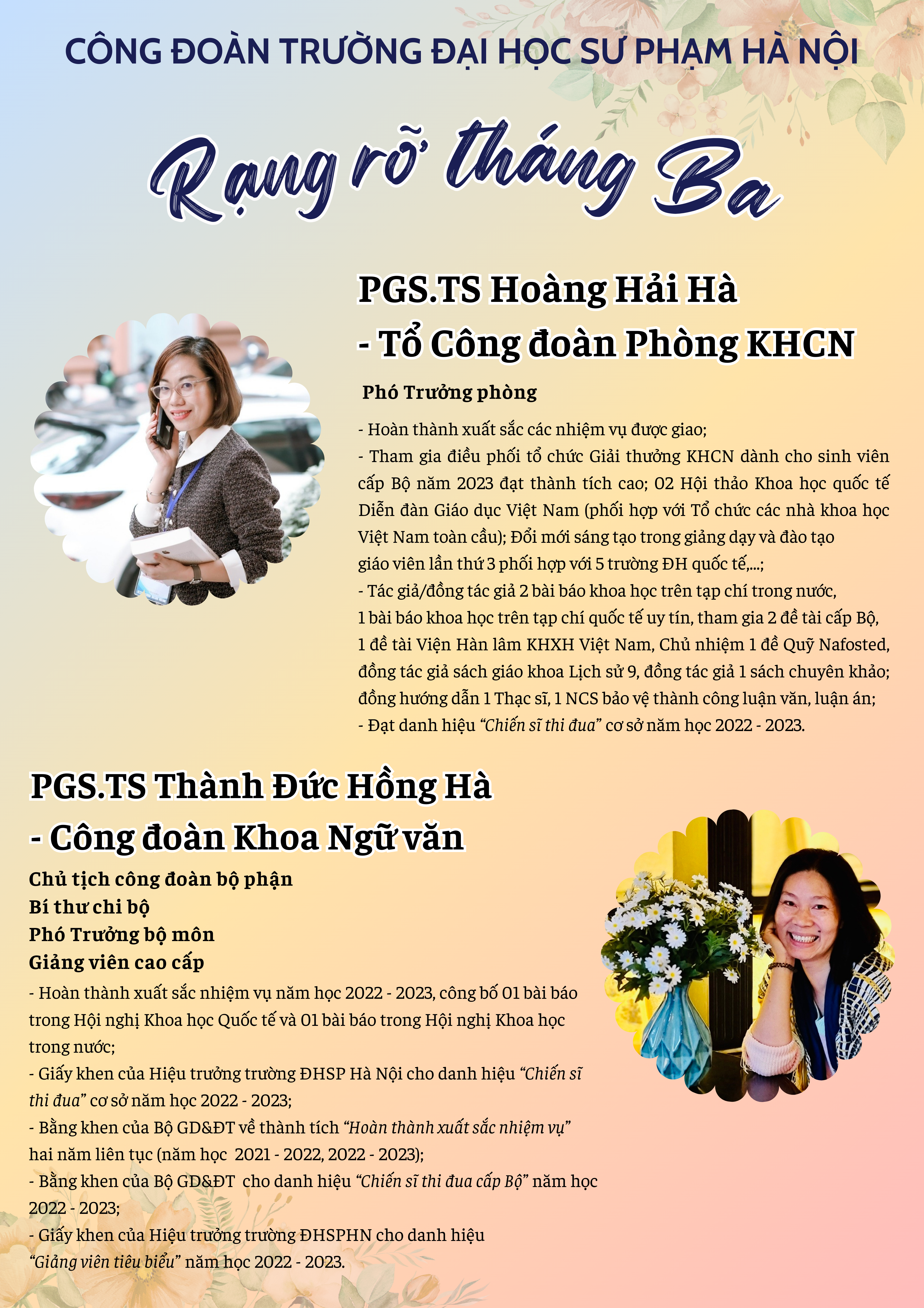 Nhân dịp chào mừng kỷ niệm 114 năm ngày Quốc tế Phụ nữ (8/3/1910 - 8/3/2024), Công đoàn Trường đã tổ chức chương trình "Rạng rỡ tháng Ba" năm 2024, tôn vinh nữ cán bộ, nhà giáo, người lao động tiêu biểu, đạt thành tích xuất sắc trong các lĩnh vực công tác chuyên môn, nghiên cứu khoa học, quản lý, phục vụ đào tạo và nữ cán bộ được phong học hàm Giáo sư, Phó Giáo sư năm 2023.