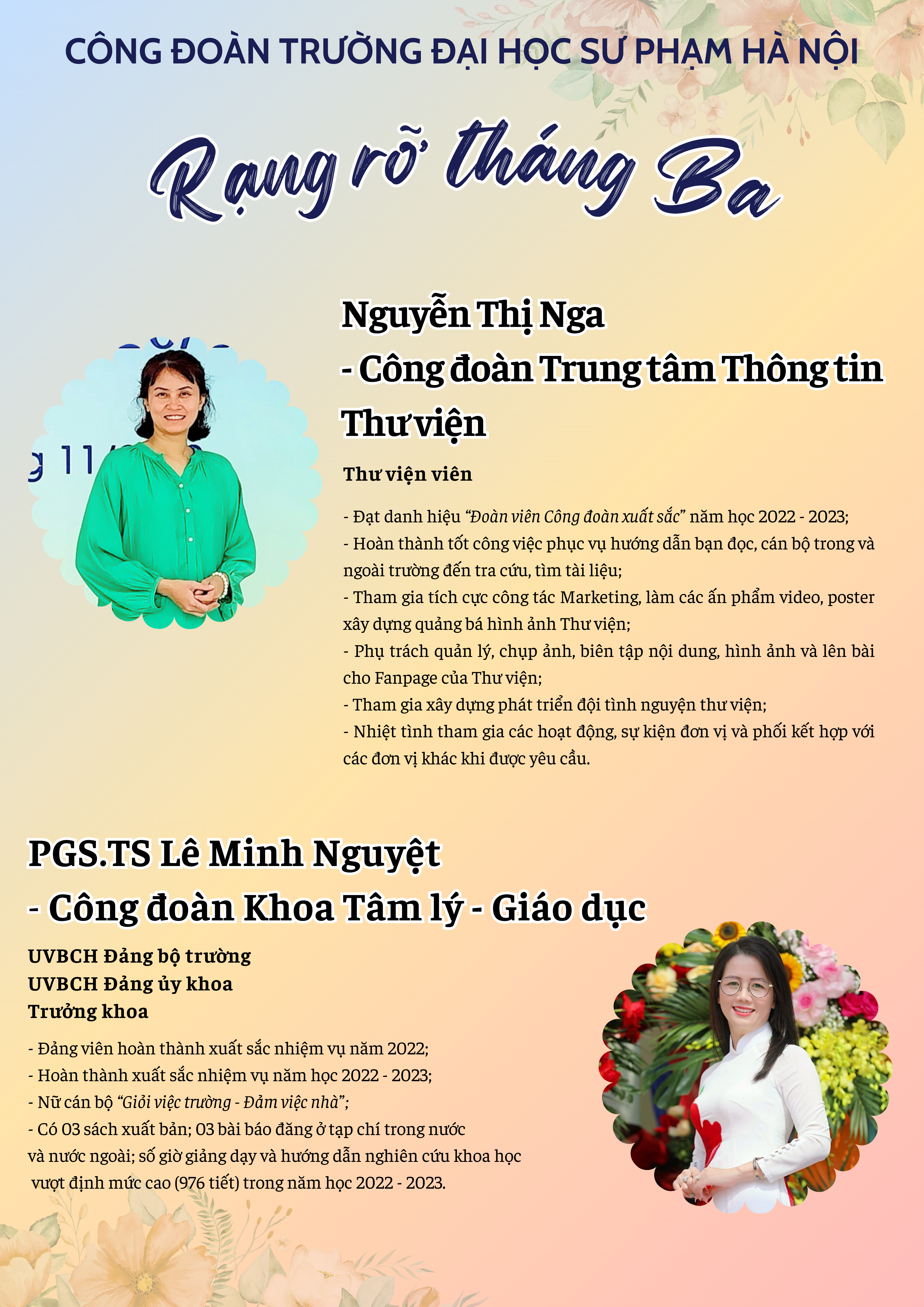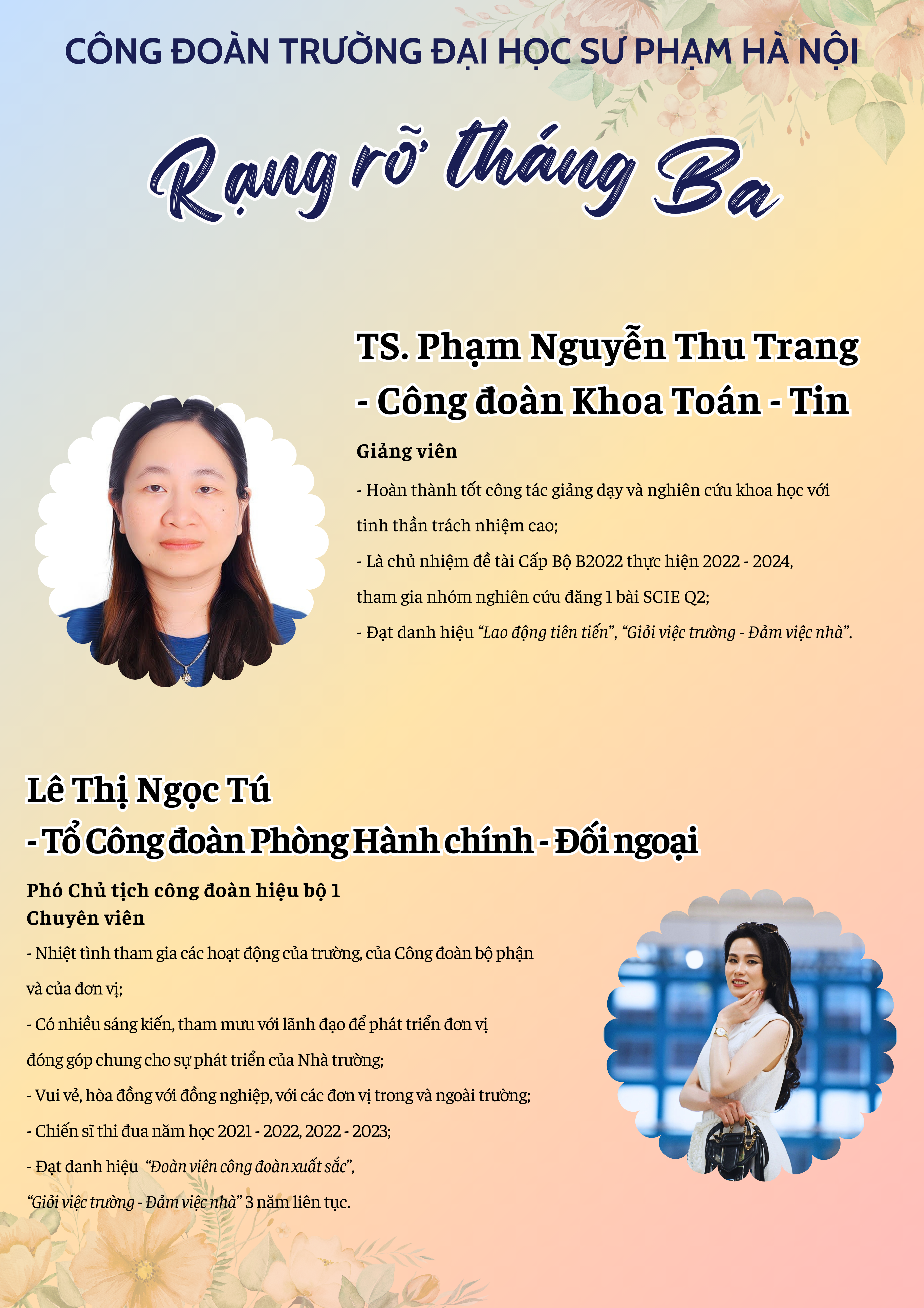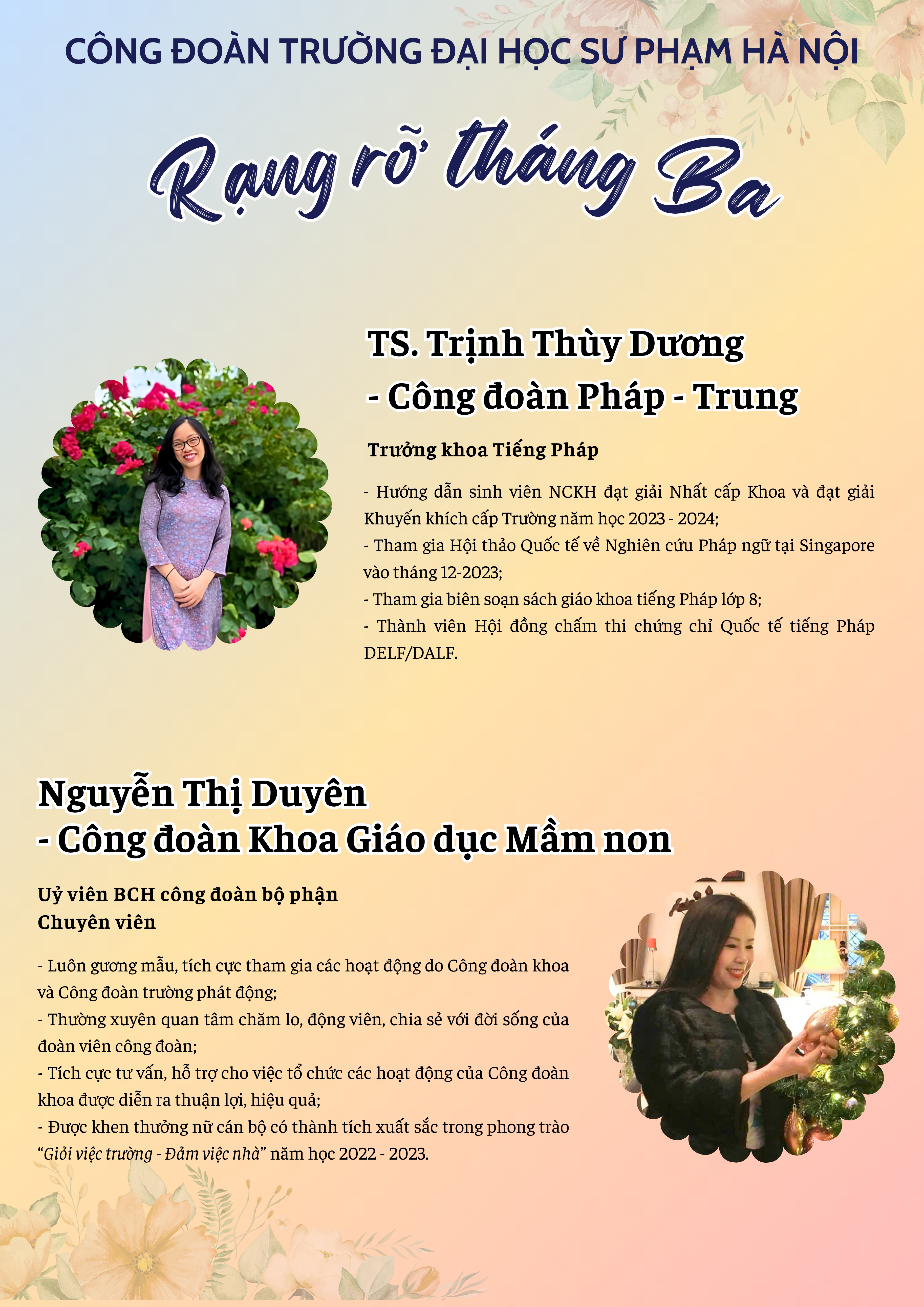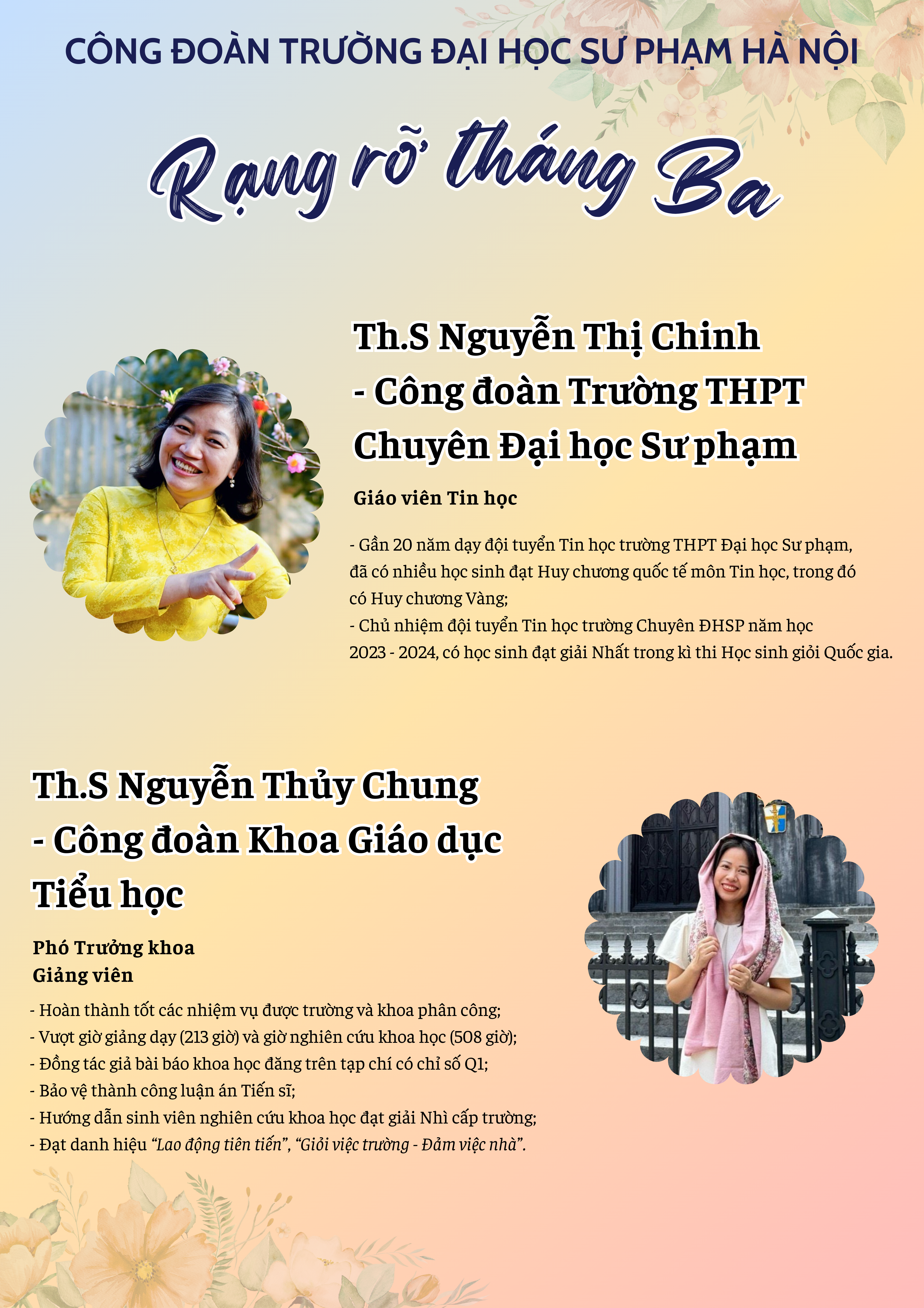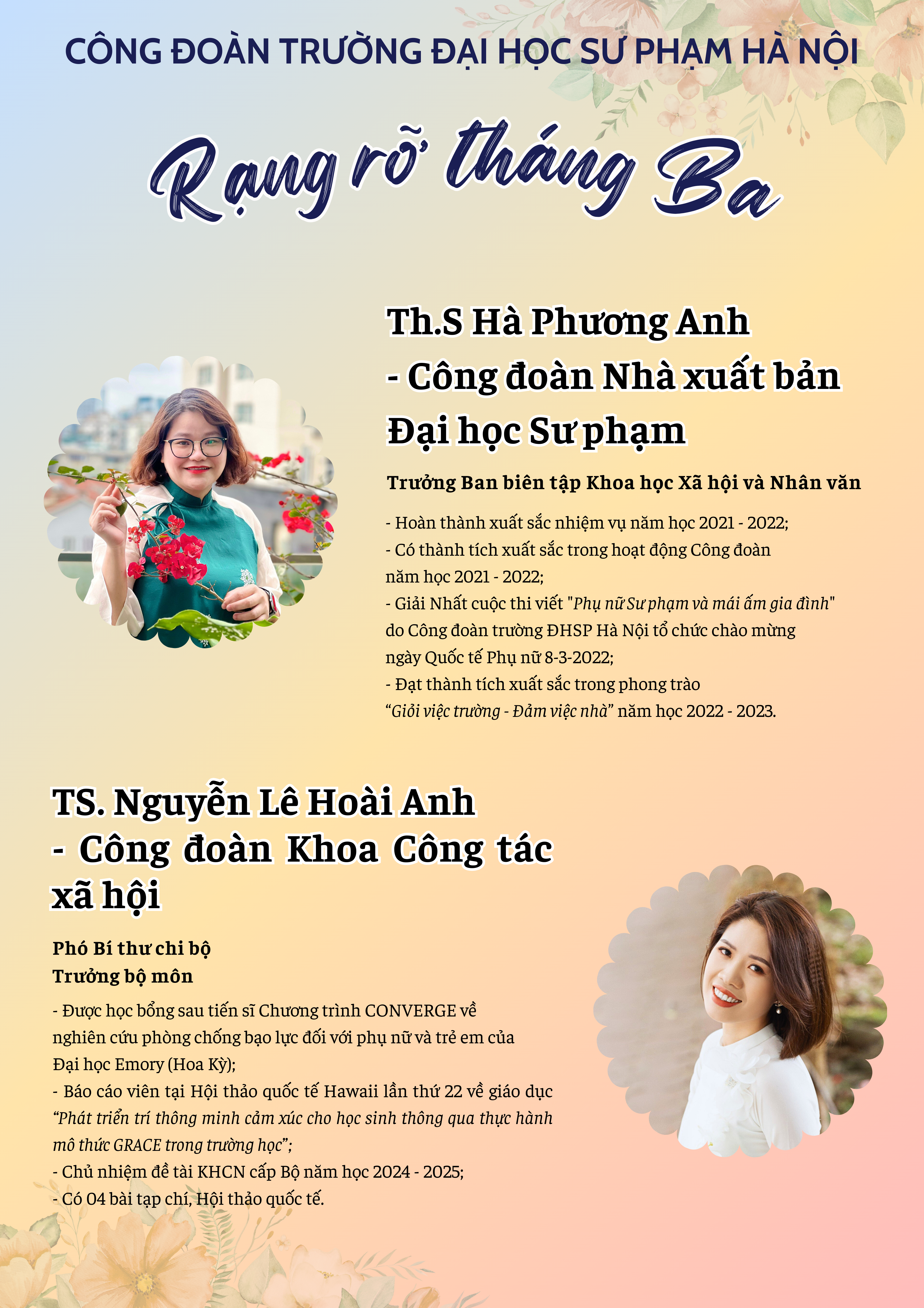 Nhân dịp chào mừng kỷ niệm 114 năm ngày Quốc tế Phụ nữ (8/3/1910 - 8/3/2024), Công đoàn Trường đã tổ chức chương trình "Rạng rỡ tháng Ba" năm 2024, tôn vinh nữ cán bộ, nhà giáo, người lao động tiêu biểu, đạt thành tích xuất sắc trong các lĩnh vực công tác chuyên môn, nghiên cứu khoa học, quản lý, phục vụ đào tạo và nữ cán bộ được phong học hàm Giáo sư, Phó Giáo sư năm 2023.