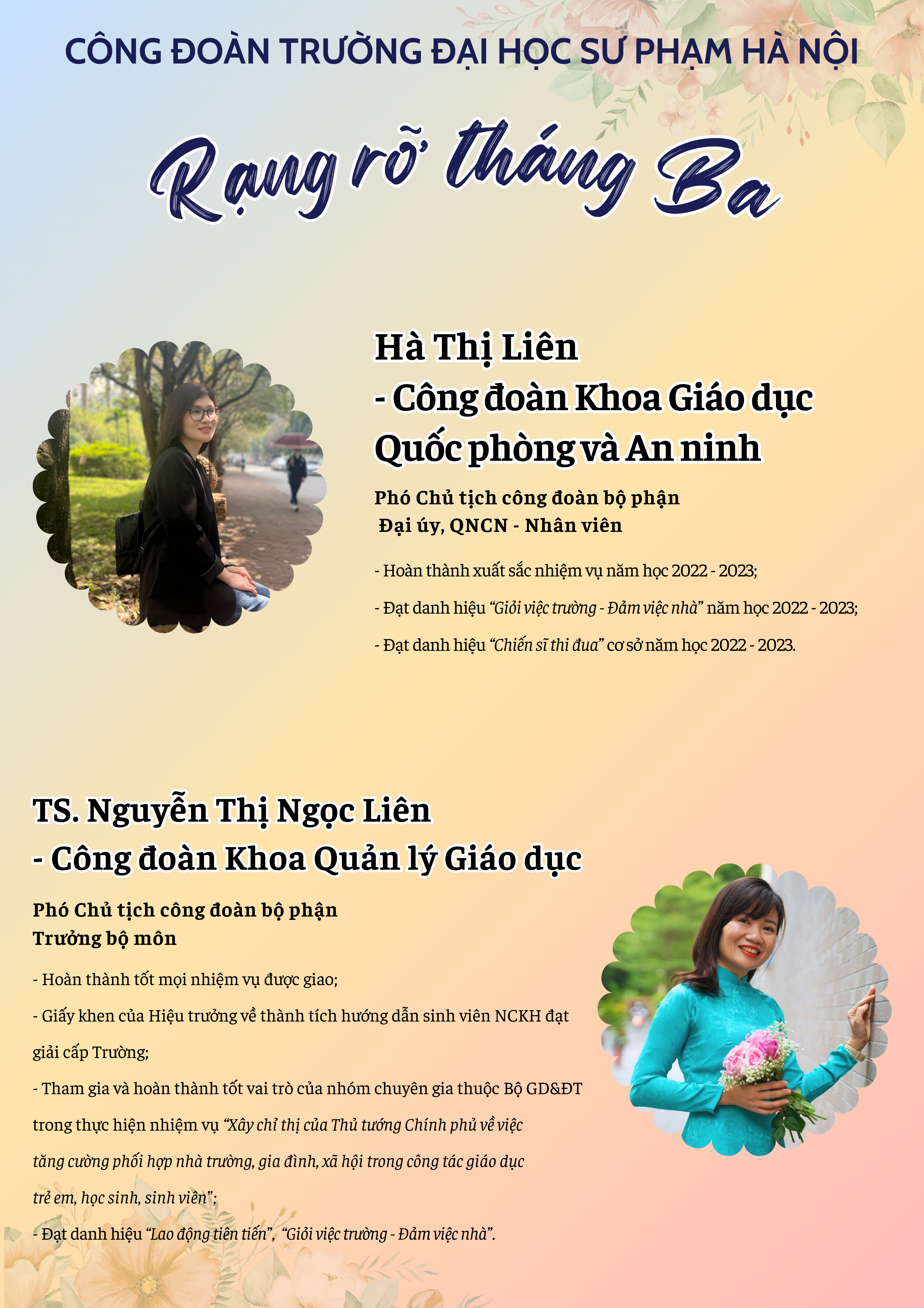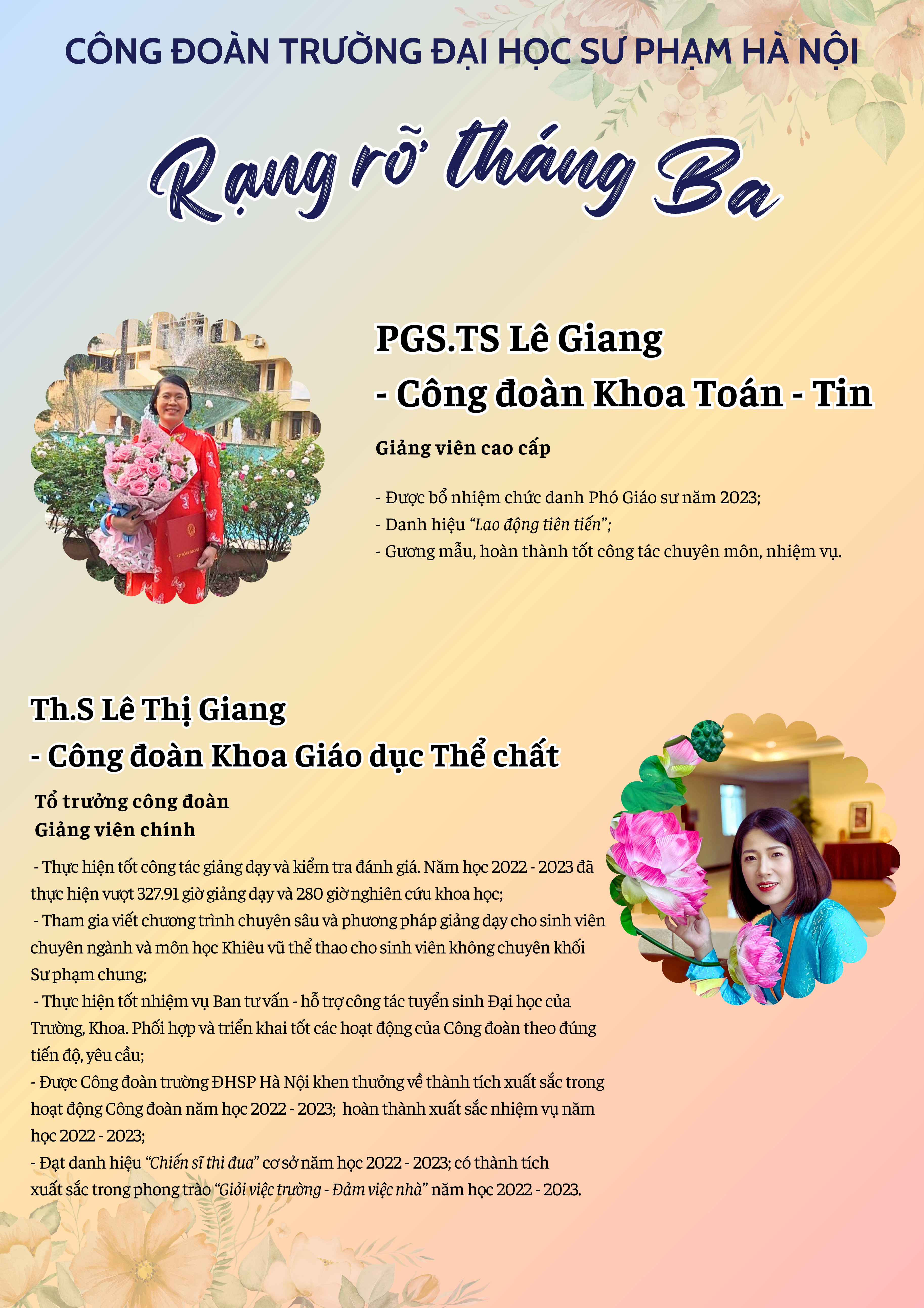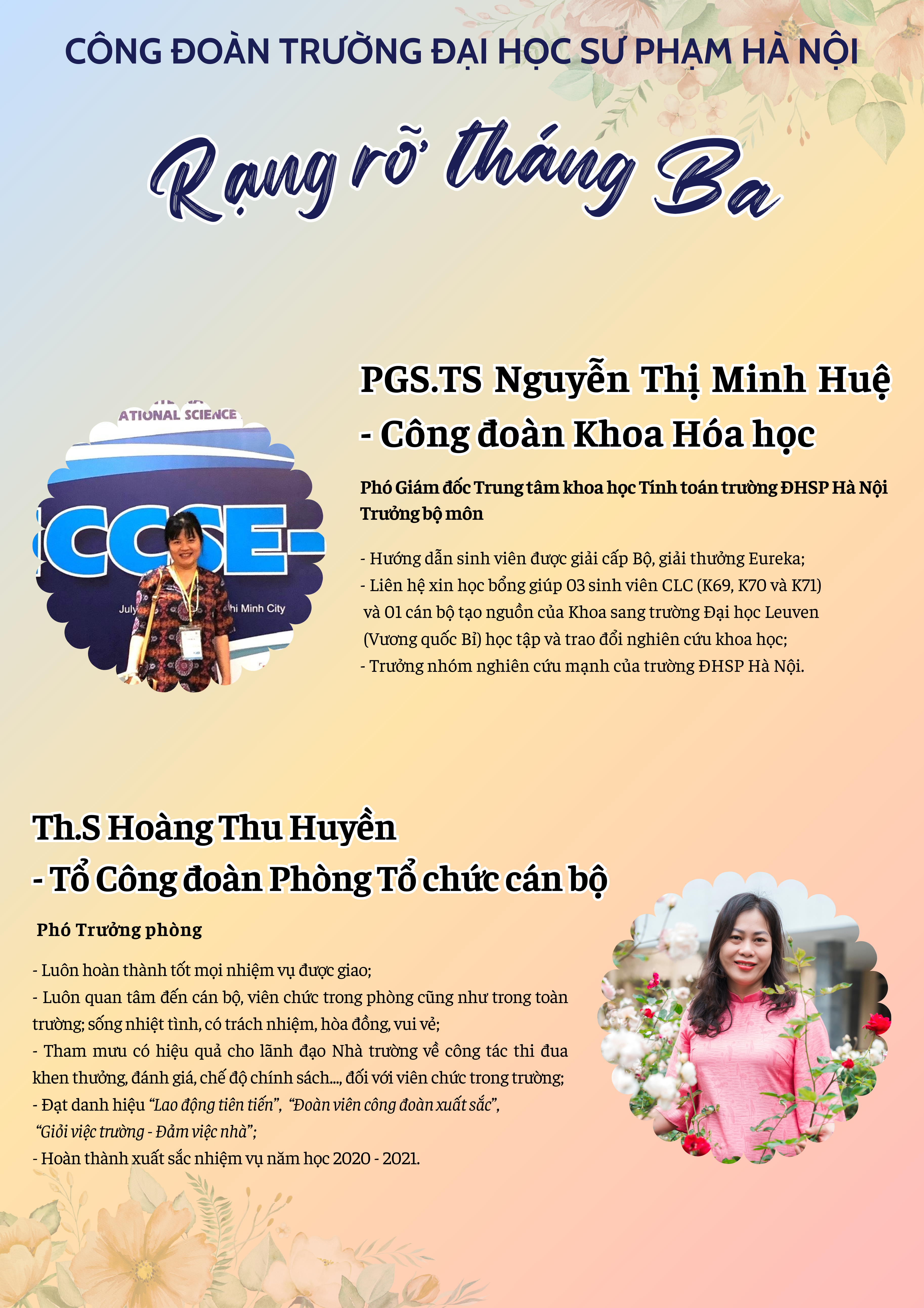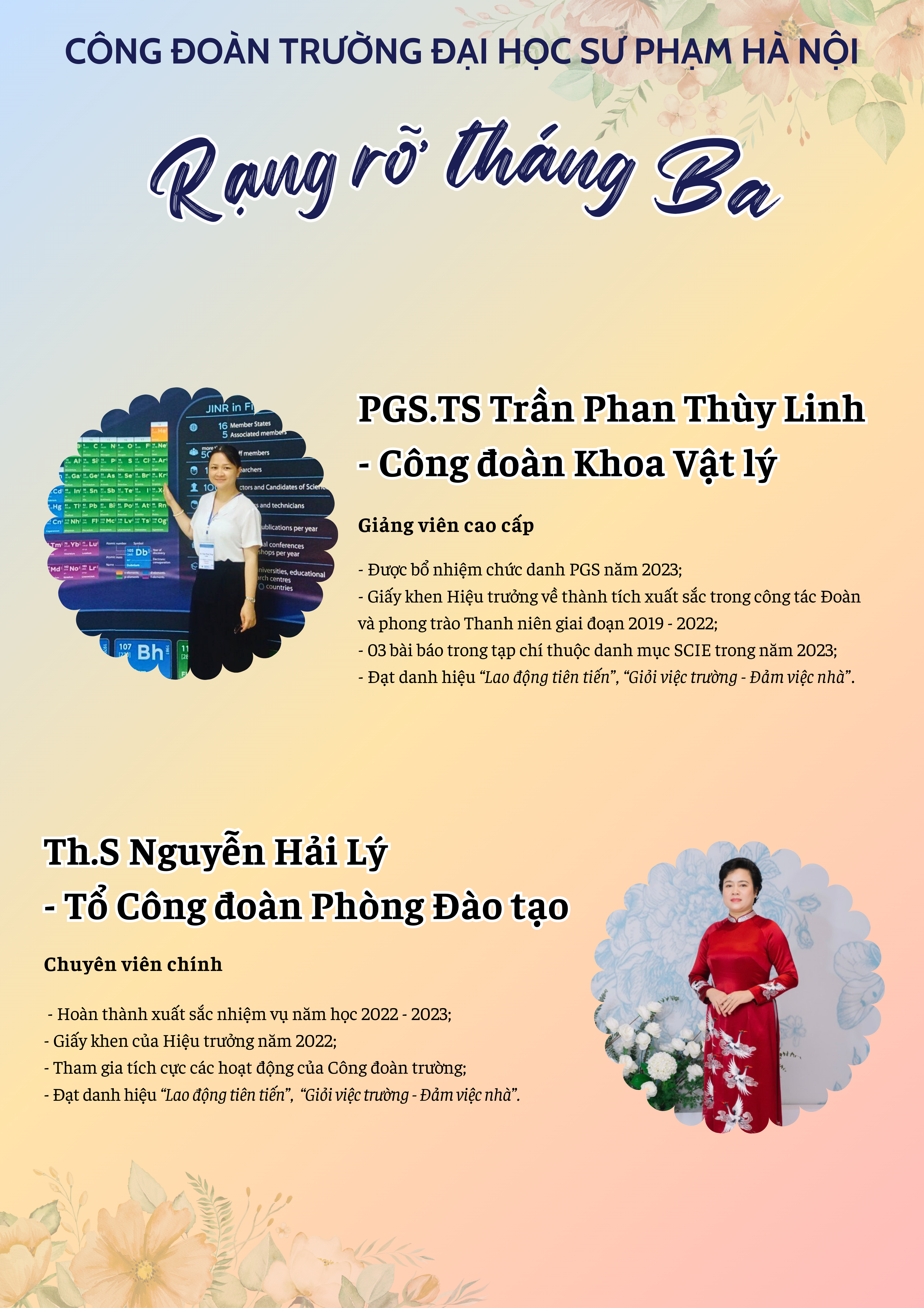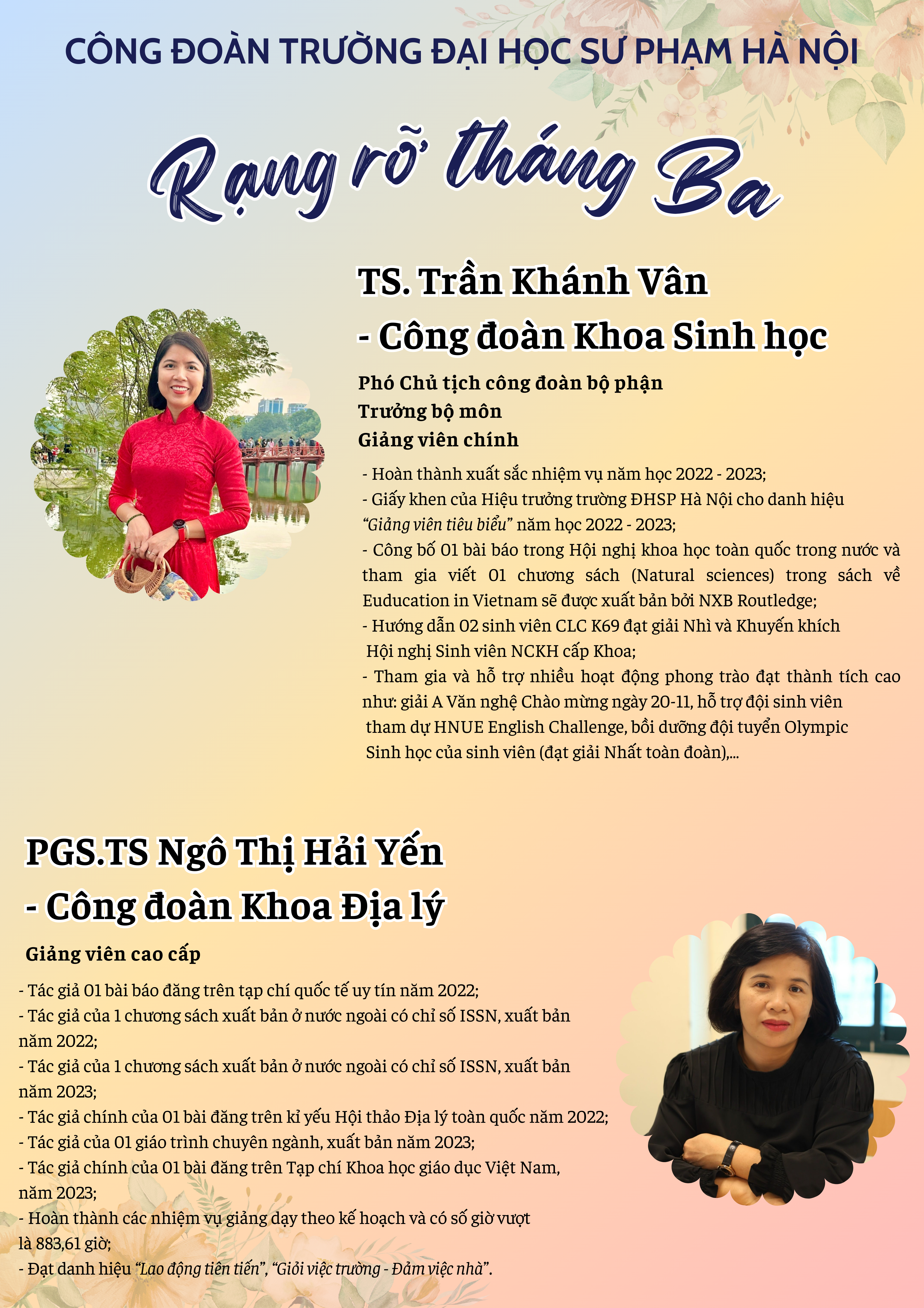 Nhân dịp chào mừng kỷ niệm 114 năm ngày Quốc tế Phụ nữ (8/3/1910 - 8/3/2024), Công đoàn Trường đã tổ chức chương trình "Rạng rỡ tháng Ba" năm 2024, tôn vinh nữ cán bộ, nhà giáo, người lao động tiêu biểu, đạt thành tích xuất sắc trong các lĩnh vực công tác chuyên môn, nghiên cứu khoa học, quản lý, phục vụ đào tạo và nữ cán bộ được phong học hàm Giáo sư, Phó Giáo sư năm 2023.